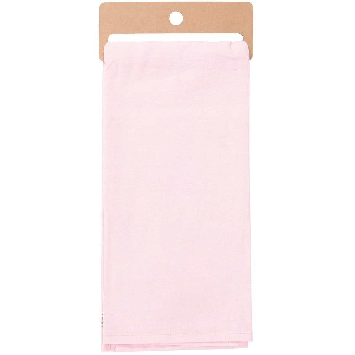 A pink cotton kitchen towel featuring a stitched art panel and gray gingham ribbon. Art panel displays a hand painted design of a highland cow wearing a wreath of vibrant spring flowers. Design is replicated from original artwork painted onto burlap canvas, giving the art a unique depth and texture. Our Floral Cow kitchen towel is machine-washable for convenient cleaning.
