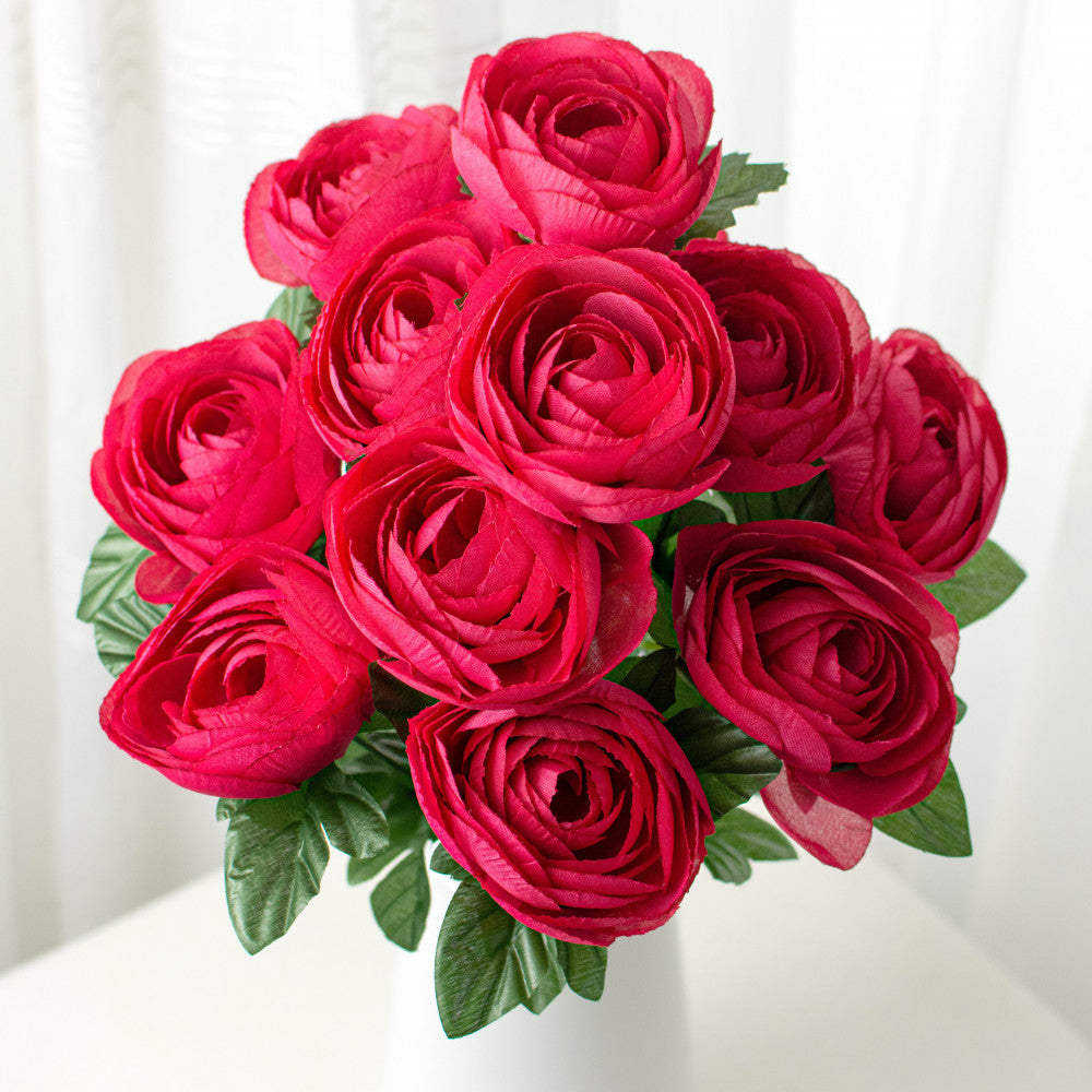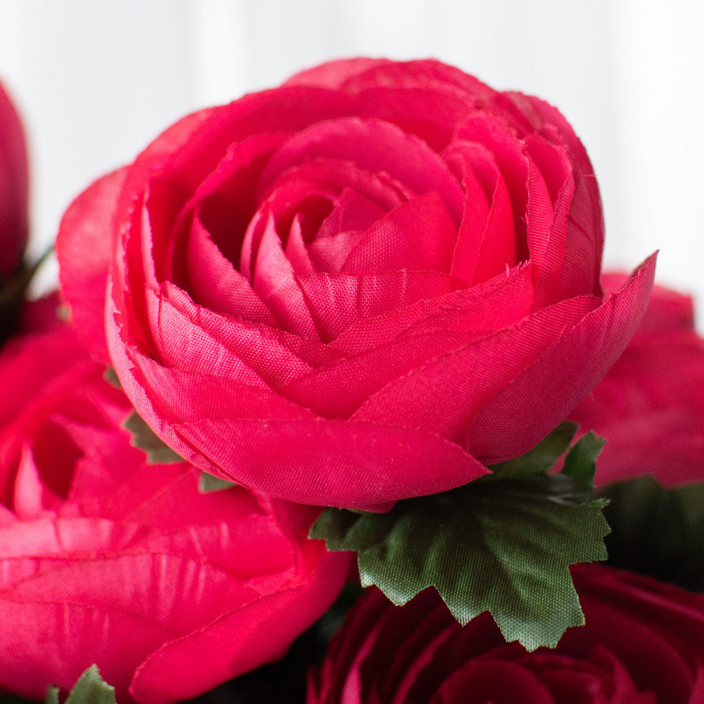 This bush has 12, tightly-wound ranunculus blooms with fuchsia pink petals. They are similar in size and shape, making this bush ideal for creating pavé flower arrangements or bouquets. Alternatively, cut apart for placement in wreaths and garlands.
