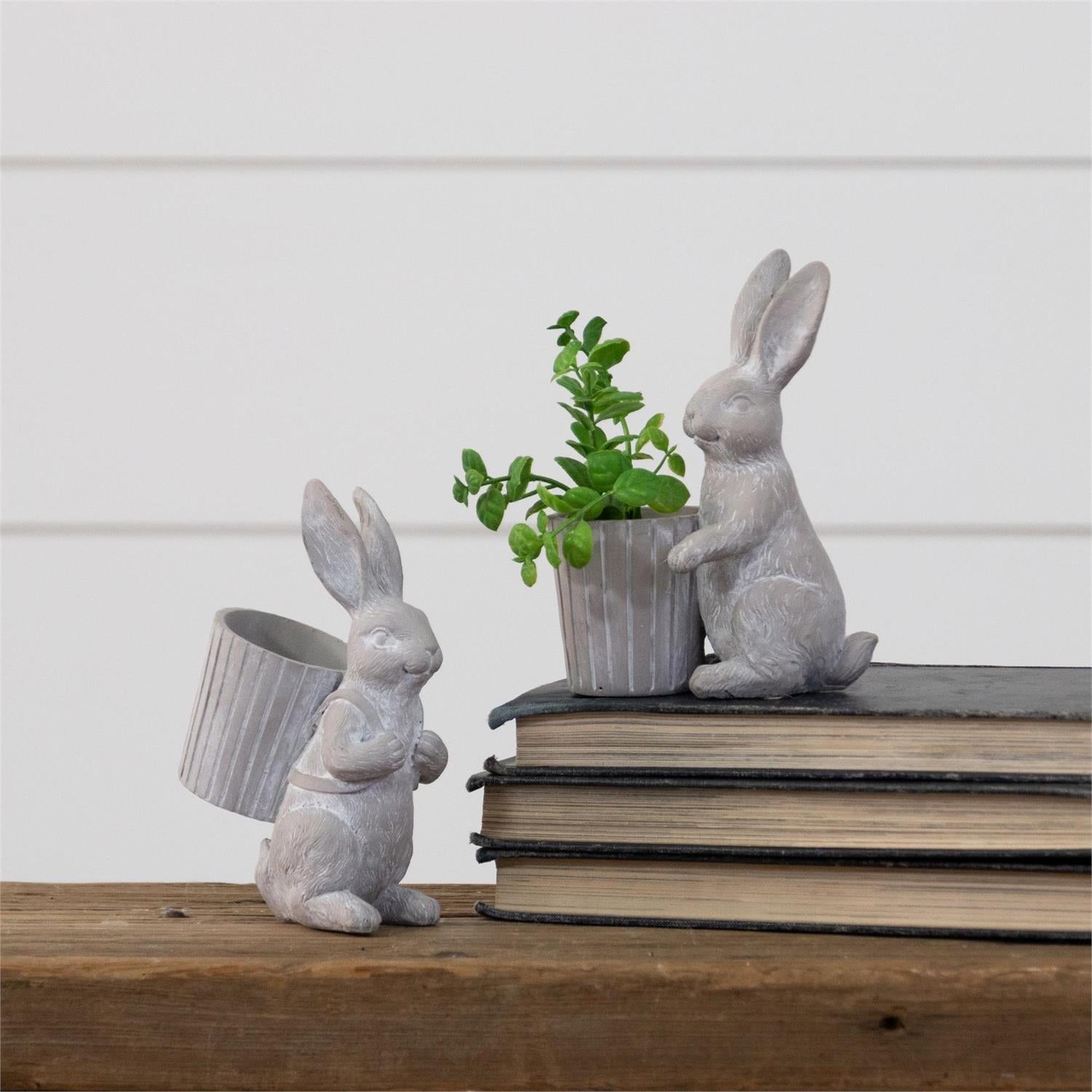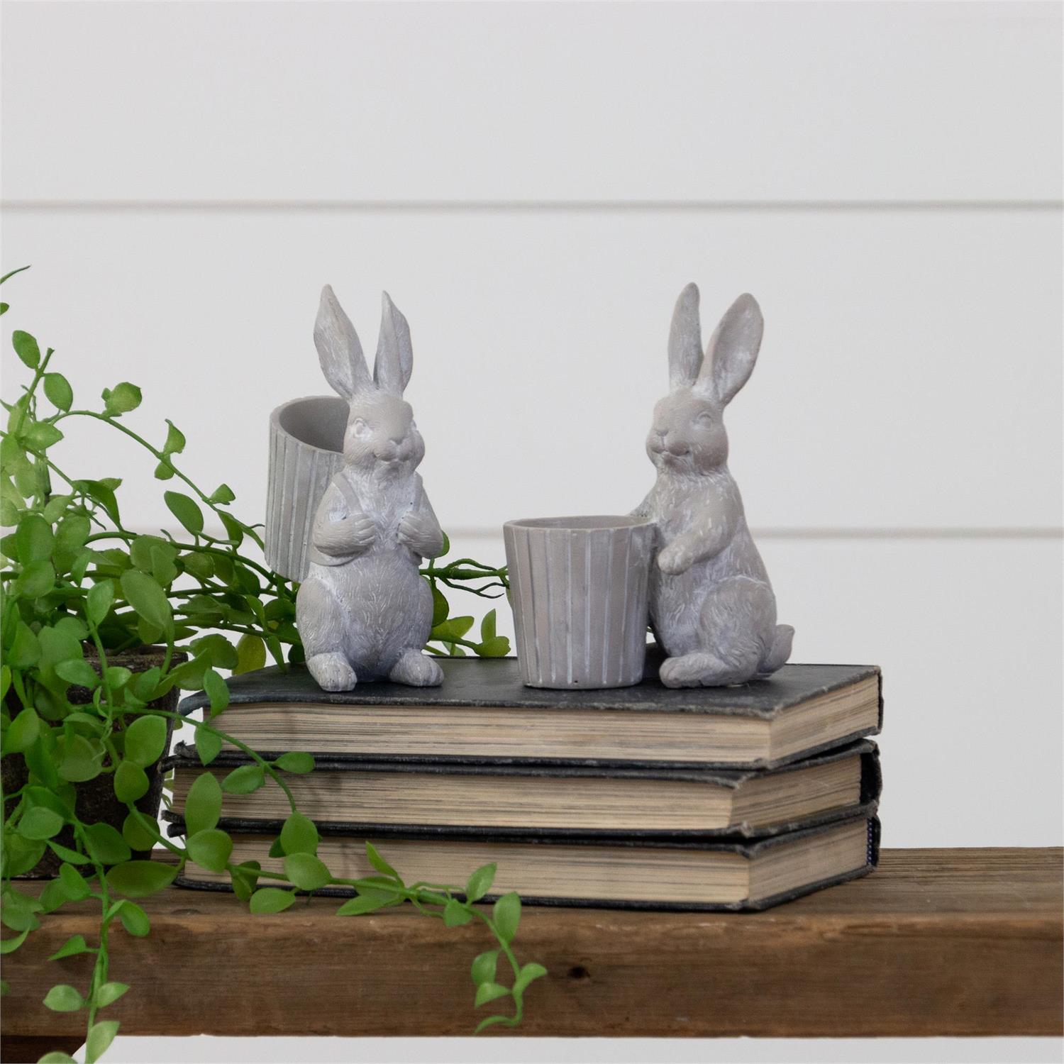 Add a sweet touch of charm to your décor with this Set of 2 Rabbits with Basket Containers, featuring softly textured bunny figures holding ribbed pots perfect for small faux greenery or seasonal accents. Finished in a neutral stone-like tone, these versatile pieces look lovely on shelves, tables, or windowsills and blend easily with farmhouse, cottage, and spring-inspired décor. (Plant not included.)