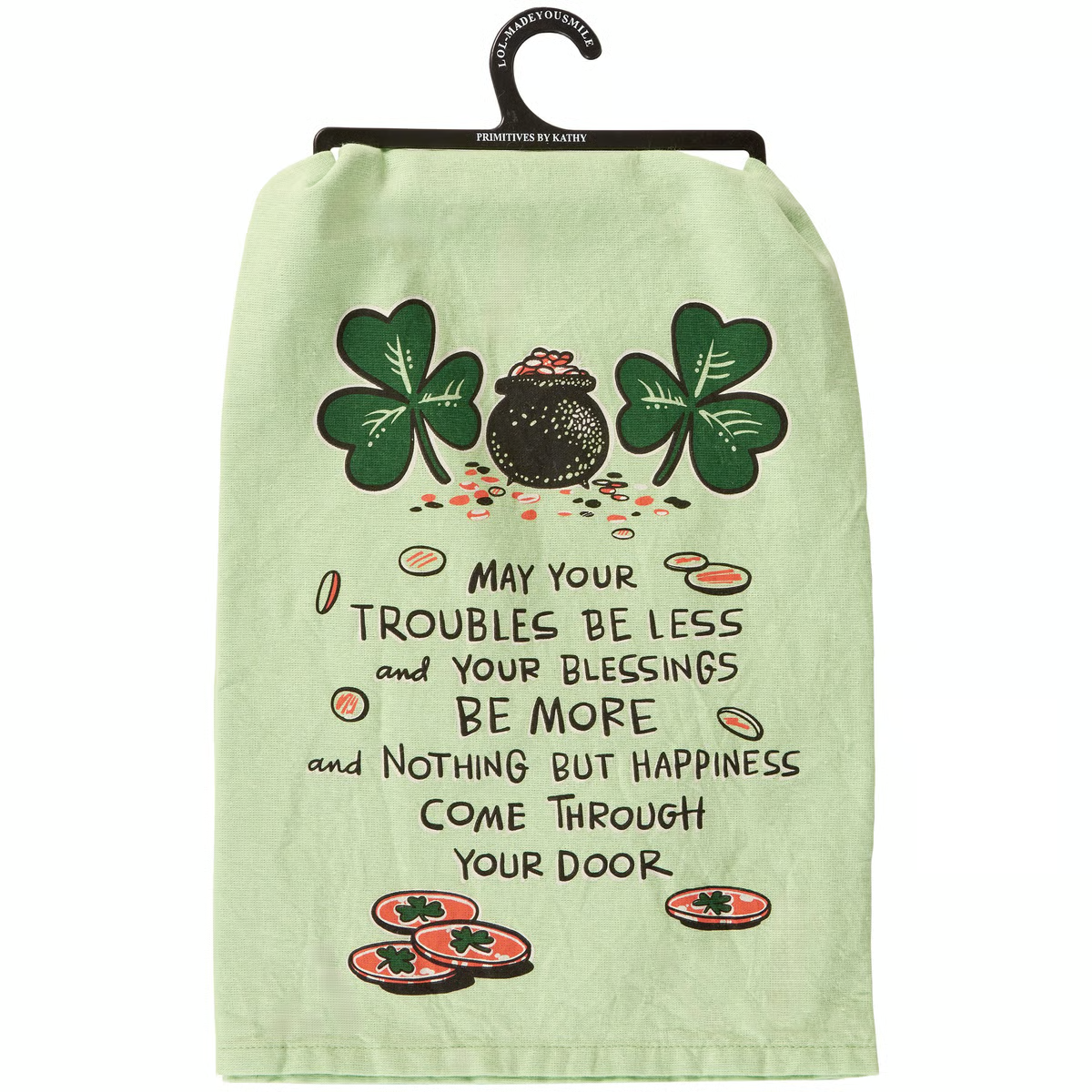 A green cotton kitchen towel from our St. Patrick's Day Collection displaying a unique hand illustrated design of shamrocks and a pot of gold with a seasonal sentiment that reads "May Your Troubles Be Less And Your Blessings Be More And Nothing But Happiness Come Through Your Door." Our Irish Blessing kitchen towel is conveniently machine-washable for easy cleaning.
