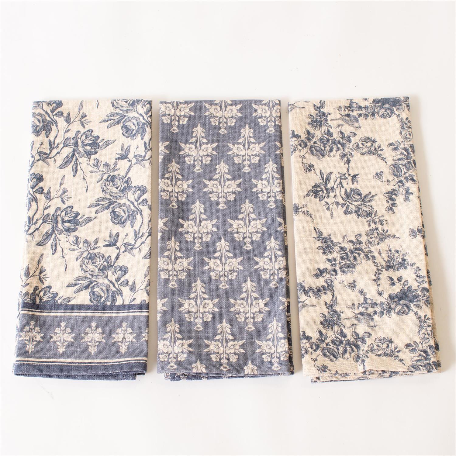 Add soft cottage charm to your kitchen with this set of French blue tea towels. Each towel features a different coordinating pattern-florals, classic motifs, and delicate vines-printed in calming shades of blue on a warm cream background. Perfect for everyday use or for adding a decorative touch to your oven handle, hooks, or gift baskets.