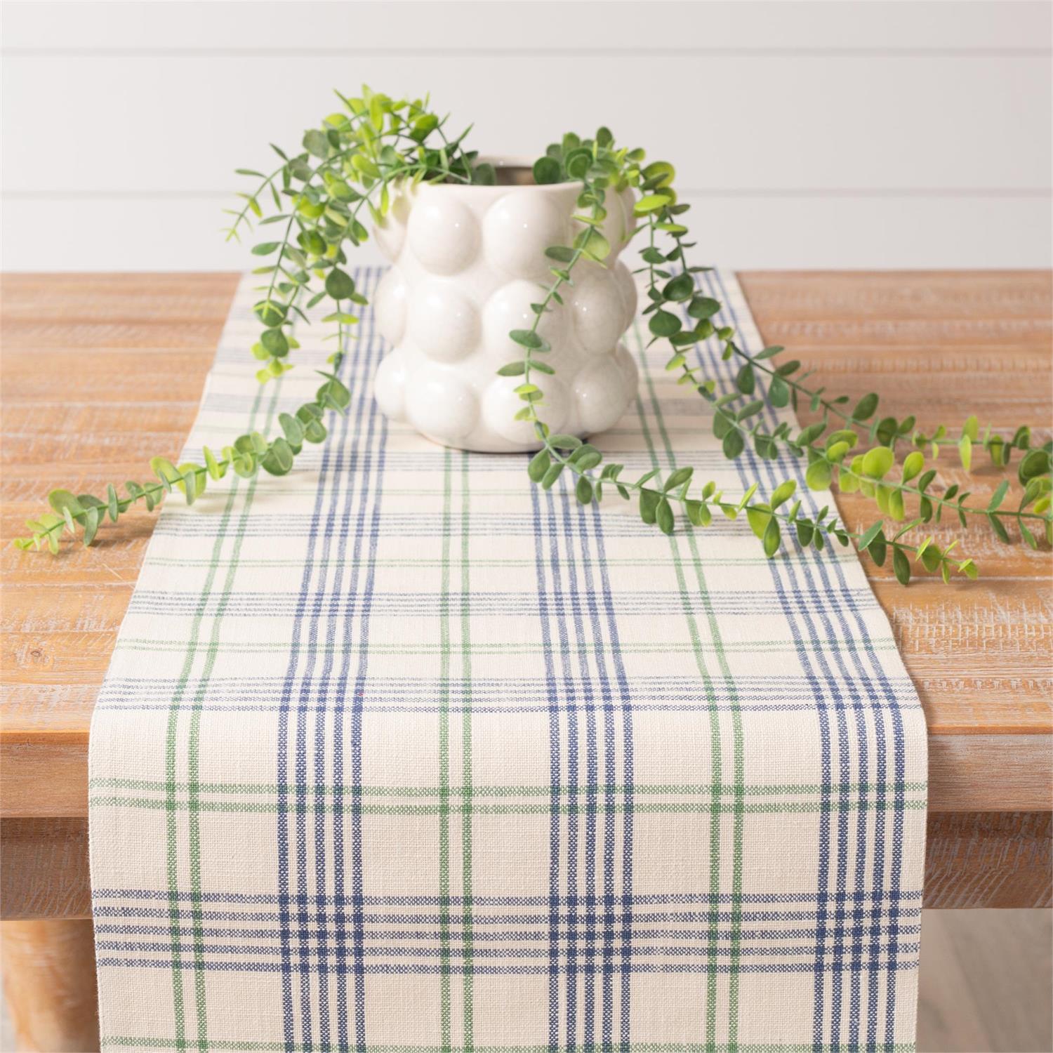Bring a fresh, easygoing feel to your space with our Lakehouse Plaid 72" Table Runner. Featuring a crisp white background with a soft blue plaid design, it's perfect for adding a light and breezy touch to everyday meals, gatherings, or lake-inspired decor.
