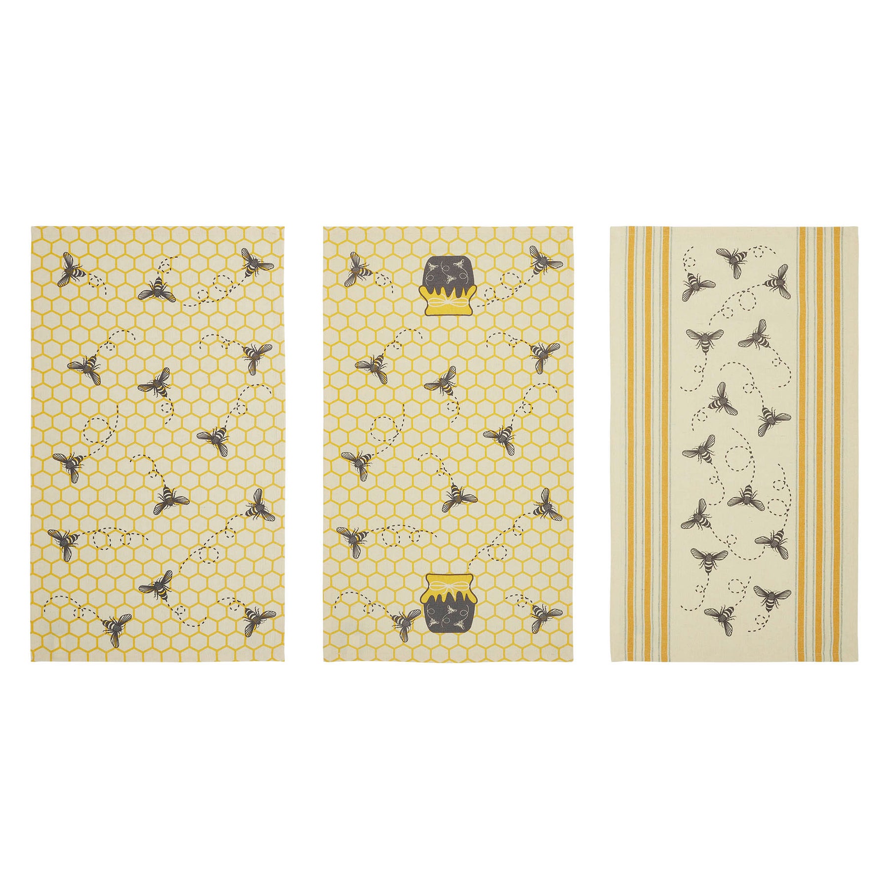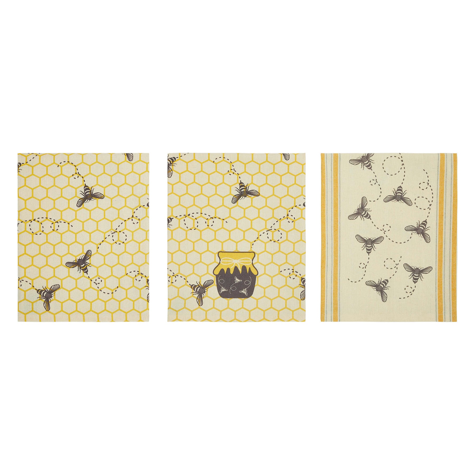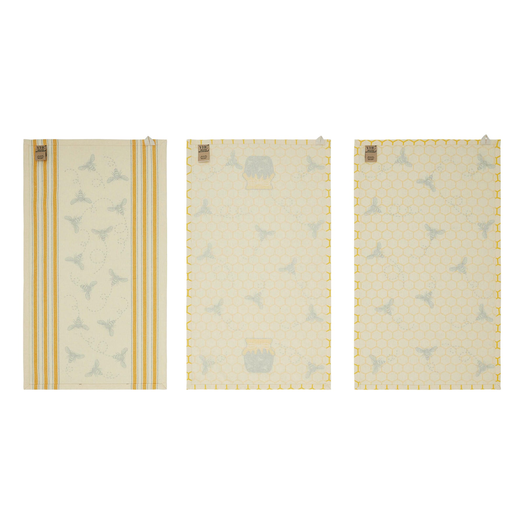 Bring a buzz of spring into your kitchen or dining room with the Buzzy Bees Honeypot Tea Towel Set of 3. These charming towels are designed to enhance any spring or Easter decor with their delightful pattern featuring honey bees and honey pots. Each towel is crafted from a blend of cotton and polyester, ensuring durability and softness. The background showcases a rich display of golden honeycomb and ticking stripes in sandal yellow and storm grey, with burnished gold accents that add a touch of warmth to the overall design.