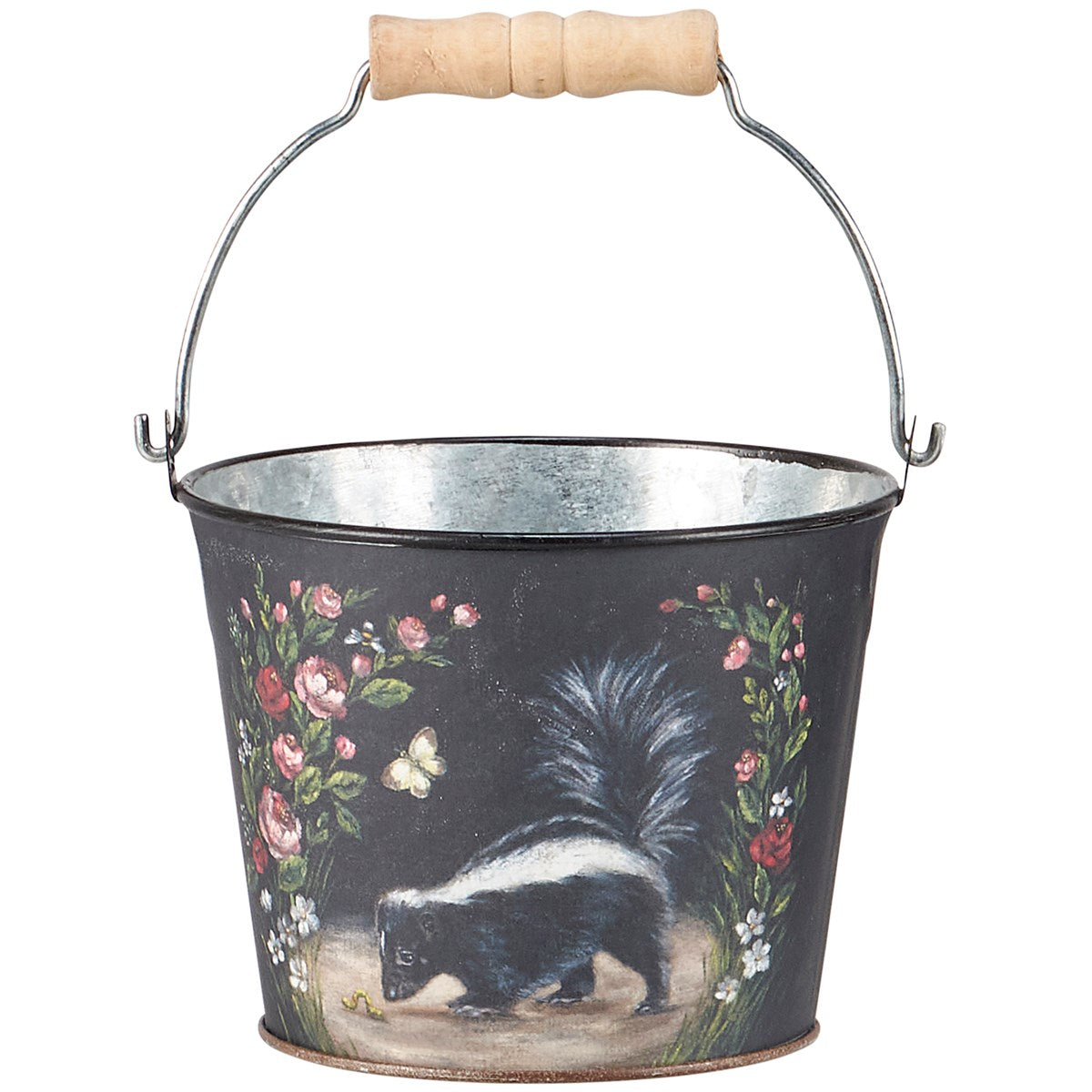 A set of four metal buckets displaying calming hand painted scenes of woodland creatures surrounded by spring flowers on each. Bucket designs are replicated from original artwork painted onto burlap canvas, giving the art a unique depth and texture. Bucket set is perfect for displaying greenery or including in a natural display. Accessories and greenery pictured not included. Our Woodland Spring bucket set includes metal handles with wooden grips for easy carrying and stack inside each other for easy storage. A rustic set of seasonal home accents with a variety of display options.