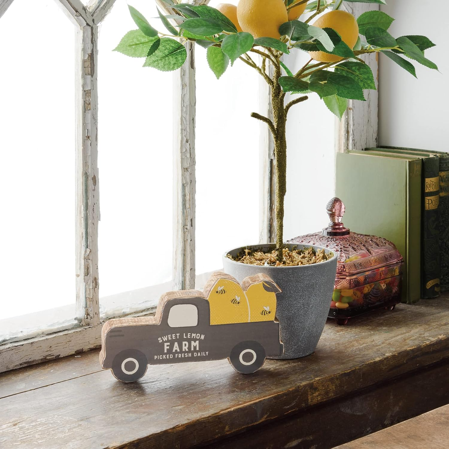 A wooden chunky sitter featuring a truck shape with "Sweet Lemon Farm Picked Fresh Daily" sentiment and oversized lemon designs. Sweet Lemon Farm Picked Fresh Daily chunky sitter is designed to free-stand alone on any flat surface.