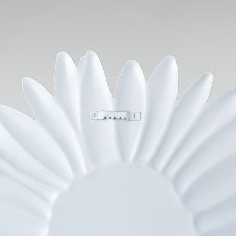 This decoration is a form cut from printed and embossed metal, creating a sunflower with shading and subtle contours while remaining flat, lightweight, waterproof, and easy to hang. We love the randomized petals - some of them are solid and some of them are yellow and white checkered.