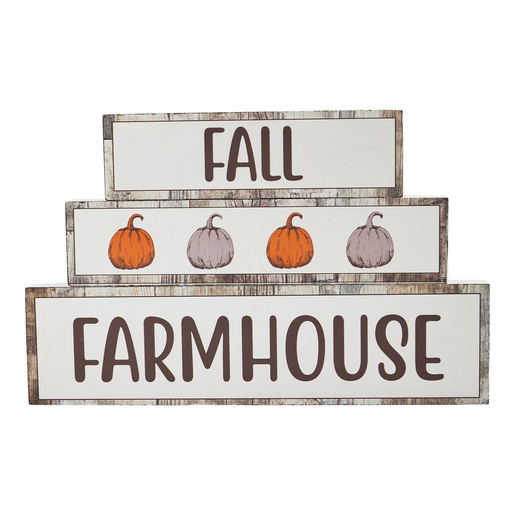 Elevate your fall decor with the charming Fall Farmhouse Pumpkins Block Sign Set. This set includes three signs in graduating sizes, each featuring the words "Fall", "Farmhouse", and a Pumpkin Motif. The warm color palette of Light Creme, Dark Brown, and Pumpkin Orange adds a cozy touch to any tabletop display, while the distressed appearance lends a rustic feel that perfectly complements farmhouse decor.
