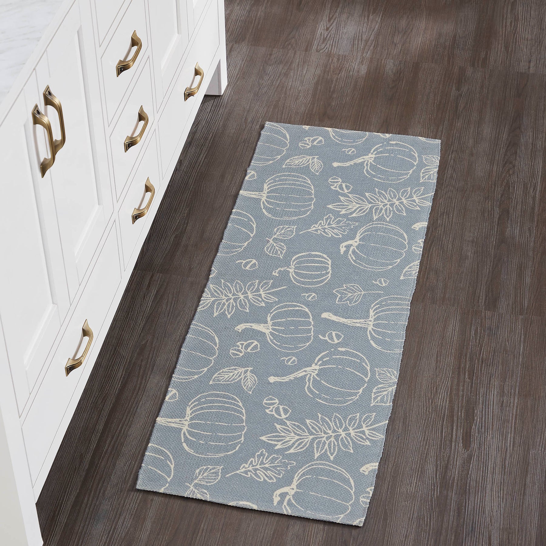 Welcome friends and family with modern fall style. The Silhouette Pumpkin Grey Rug measures 17x48 inches and is constructed with recycled plastic for a textured and water-resistant surface that is perfect for entryways and kitchens. The deep grey fabric is accented with a cream pattern featuring printed pumpkins, leaves and acorns for a festive fall design.