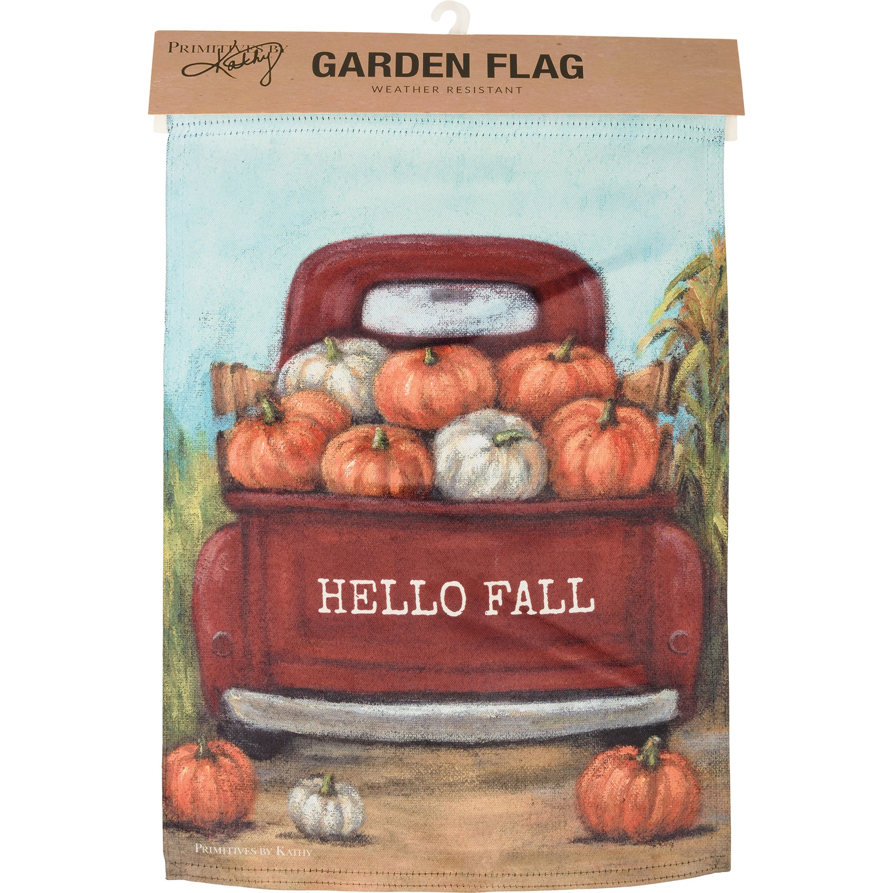 A double-sided polyester garden flag from our Fall & Harvest Collection featuring a truck with pumpkins in the back design with "Hello Fall" sentiment. Design is replicated from original artwork painted onto burlap canvas, giving the art a unique depth and texture. Our Hello Fall garden flag is weather-resistant and features an opening to hang on our Garden Flag Pole. Hand-wash only.