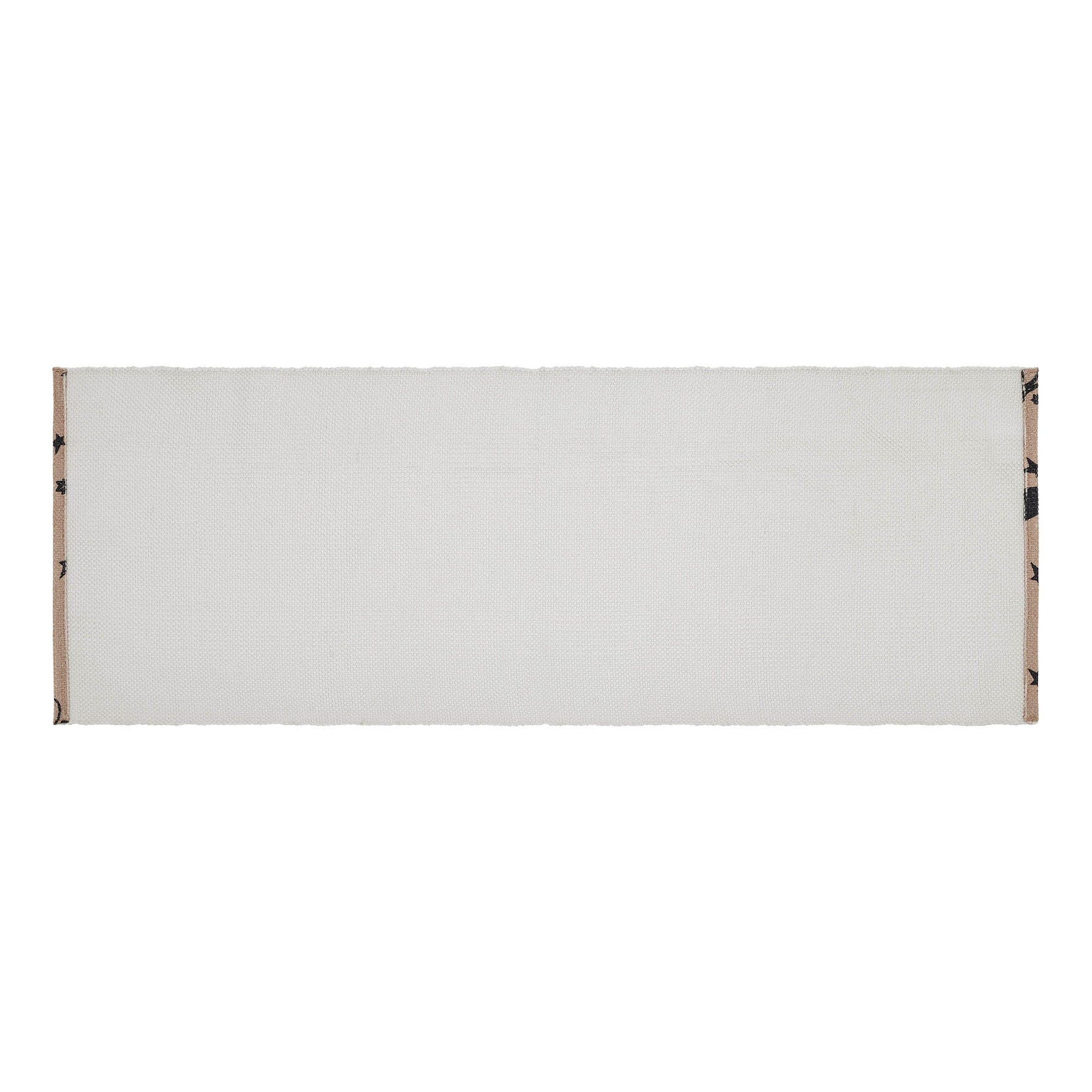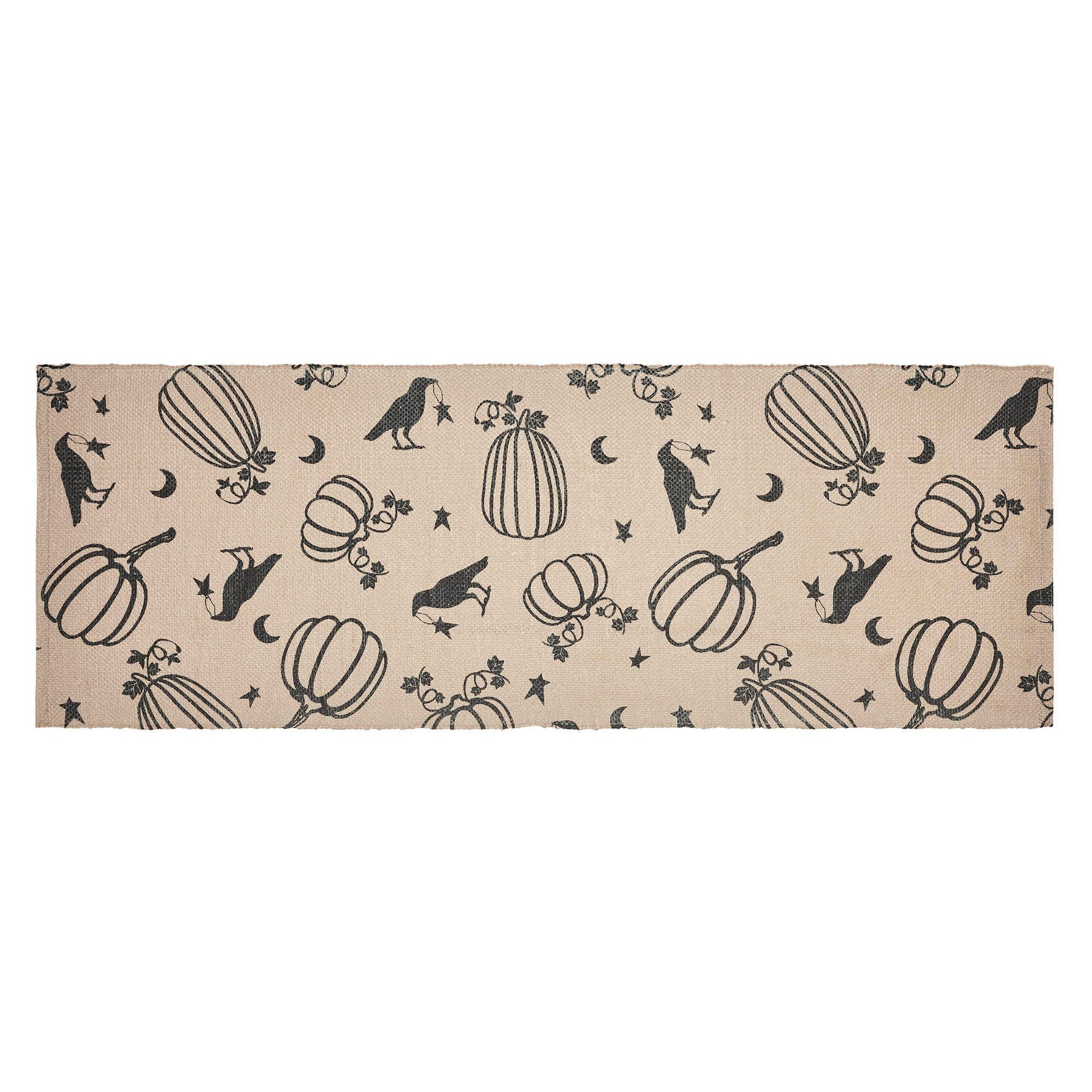 Welcome friends and family with modern fall style. The Raven Harvest Indoor/Outdoor Rug measures 17x48 inches and is constructed with recycled plastic for a textured and water-resistant surface that is perfect for entryways and kitchens. The deep tan fabric is accented with a caviar black pattern featuring printed pumpkins, ravens and stars with crescent moons for a festive fall design.
