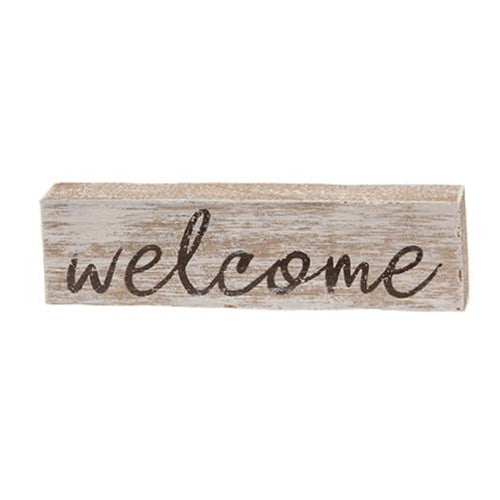 Welcome Autumn Green Truck Blocks is a set of three wooden blocks perfect for decorating tabletops for Fall. The set includes two quote blocks, "Welcome" and "Autumn", each natural wood with distressed white paint. The "welcome" block.