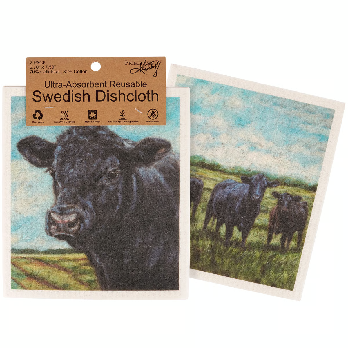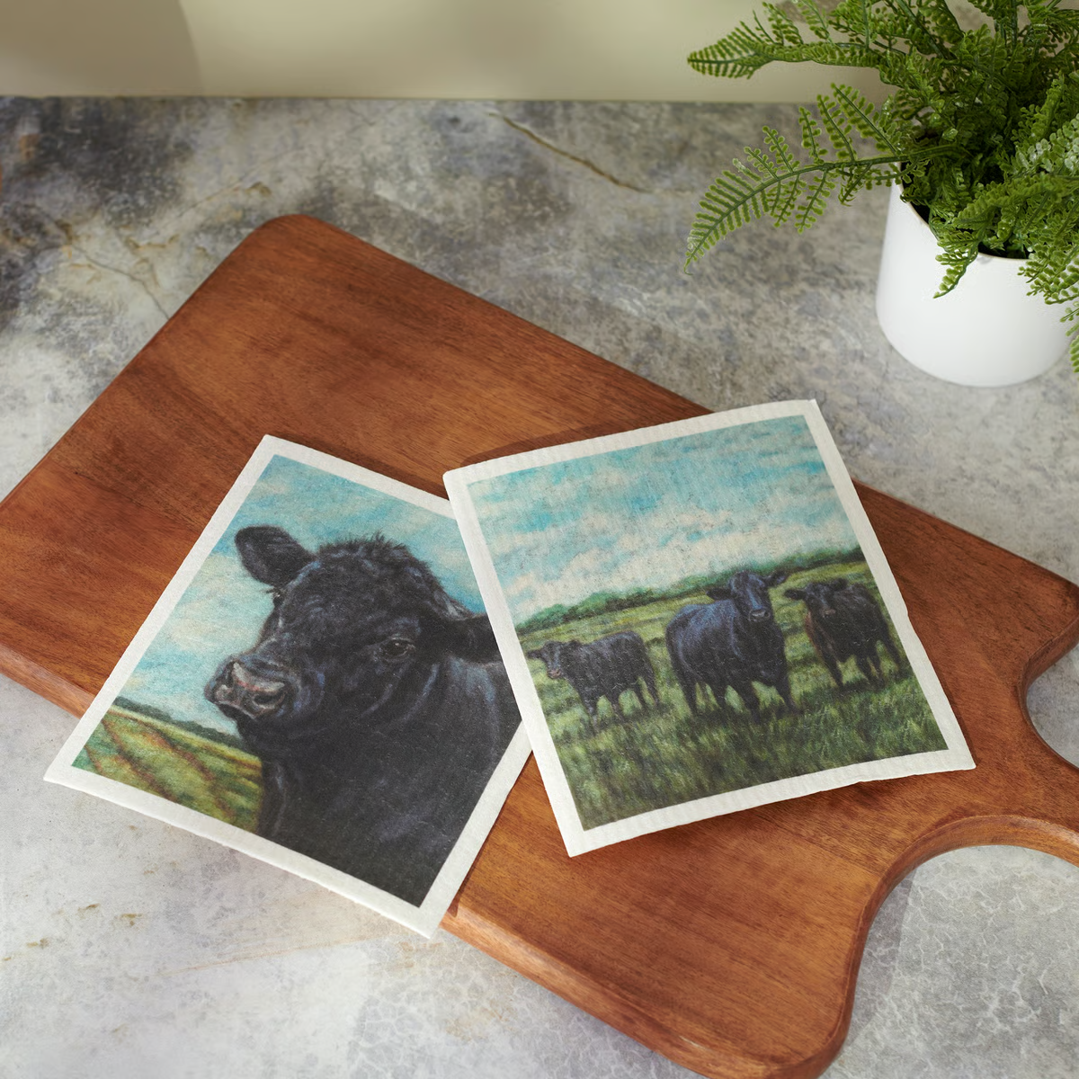 Safe to use on all types of surfaces, eco-friendly Swedish Dishcloths dry quickly and are antibacterial for more hygienic cleaning with reduced waste. This set of 2 Swedish Dishcloths from our Farmhouse Collection features charming scenes of angus cows in a field. Cow designs are replicated from original artwork painted onto burlap canvas, giving the art a unique depth and texture. Our Angus Cows Swedish cloth set is ultra-absorbent and conveniently machine-washable for easy cleaning and reuse. A rustic farm-themed set of reusable dishcloths perfect for replacing dull sponges and paper towels with long-lasting colorful designs.