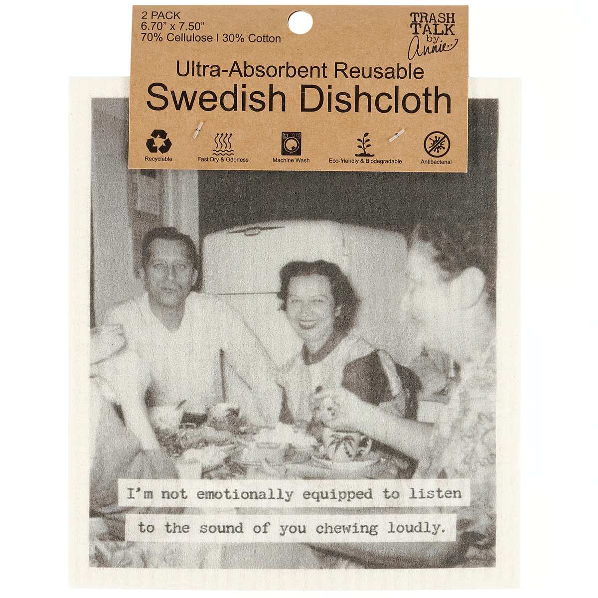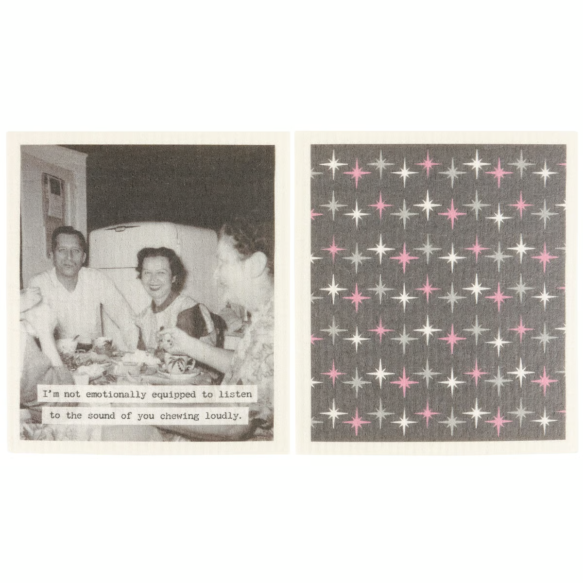 Safe to use on all types of surfaces, eco-friendly Swedish Dishcloths dry quickly and are antibacterial for more hygienic cleaning with reduced waste. This fun set of 2 Swedish Dishcloths from our Trash Talk By Annie Collection flaunts vintage inspired designs complemented with a sassy sentiment. Designs include a vintage black and white photograph with a humorous sentiment that reads "I'm Not Emotionally Equipped To Listen To The Sound Of You Chewing Loudly." on one dishcloth and a retro pink and gray pattern on the other dishcloth. Our Chewing Loudly Swedish dishcloth set is ultra-absorbent and conveniently machine-washable for easy cleaning and reuse.