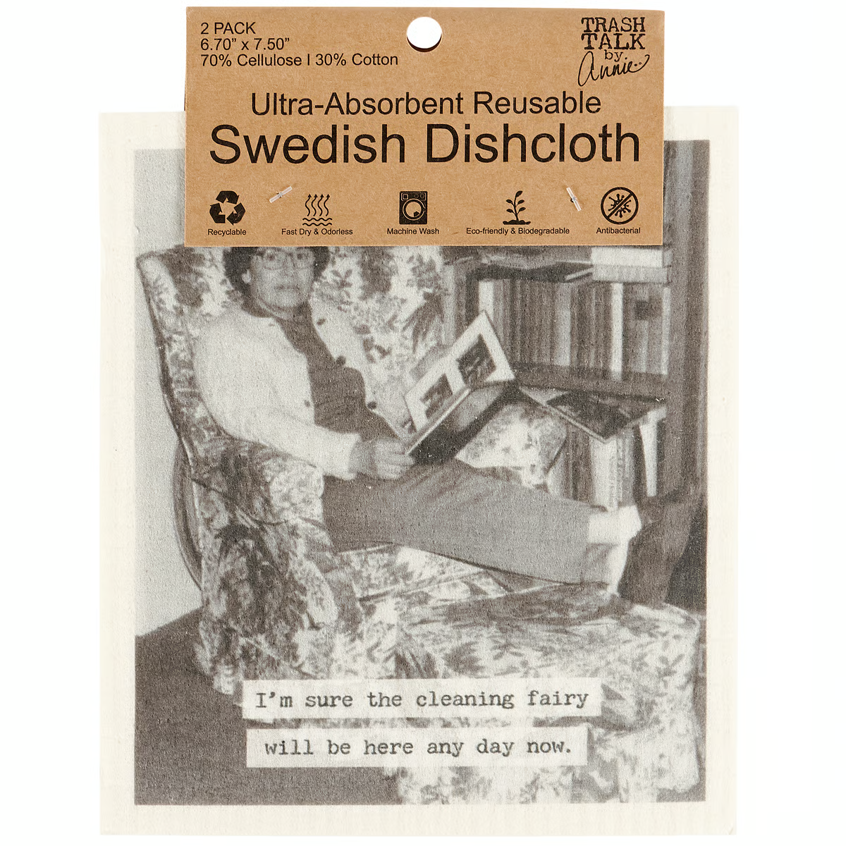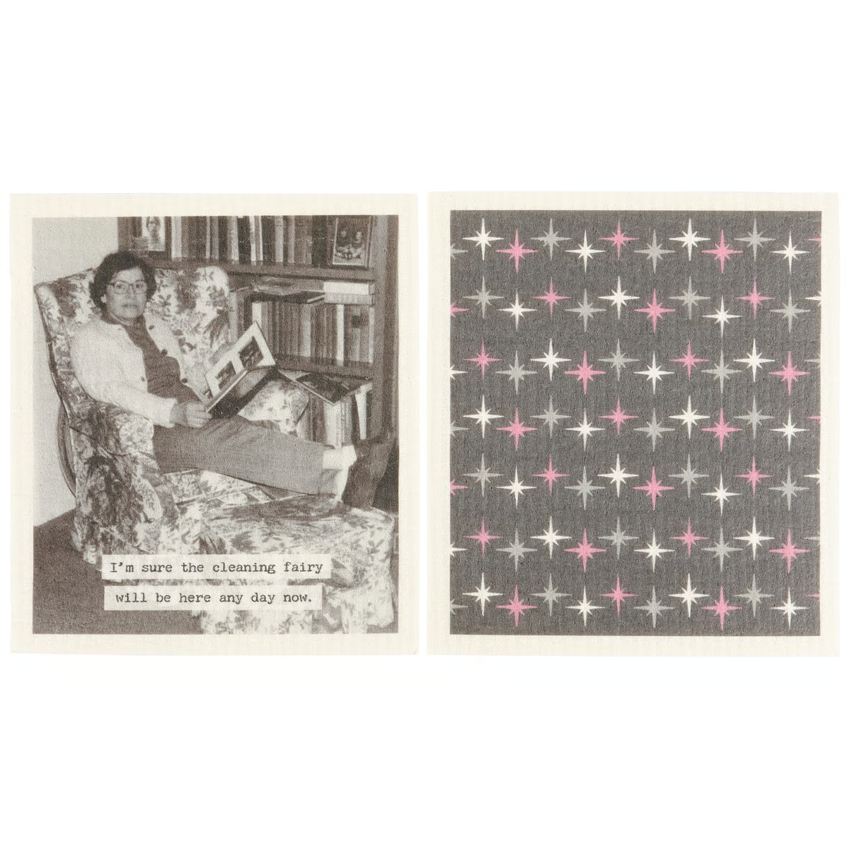Safe to use on all types of surfaces, eco-friendly Swedish Dishcloths dry quickly and are antibacterial for more hygienic cleaning with reduced waste. This fun set of 2 Swedish Dishcloths from our Trash Talk By Annie Collection flaunts vintage inspired designs complemented with a sassy sentiment. Designs include a vintage black and white photograph with a humorous sentiment that reads "I'm Sure The Cleaning Fairy Will Be Here Any Day Now." on one dishcloth and a retro pink and gray pattern on the other dishcloth. Our Cleaning Fairy Swedish dishcloth set is ultra-absorbent and conveniently machine-washable for easy cleaning and reuse.