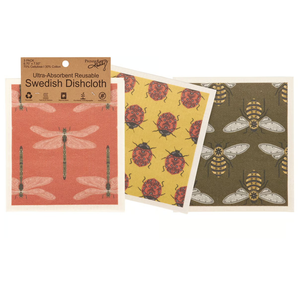 Safe to use on all types of surfaces, eco-friendly Swedish Dishcloths dry quickly and are antibacterial for more hygienic cleaning with reduced waste. This set of 3 Swedish Dishcloths from our Garden Collection features various garden bug designs with hand illustrated floral details. Garden bug designs include dragonflies, honey bees, and ladybugs. Our Garden Bug Swedish Dishcloth set is machine-washable for convenient cleaning.