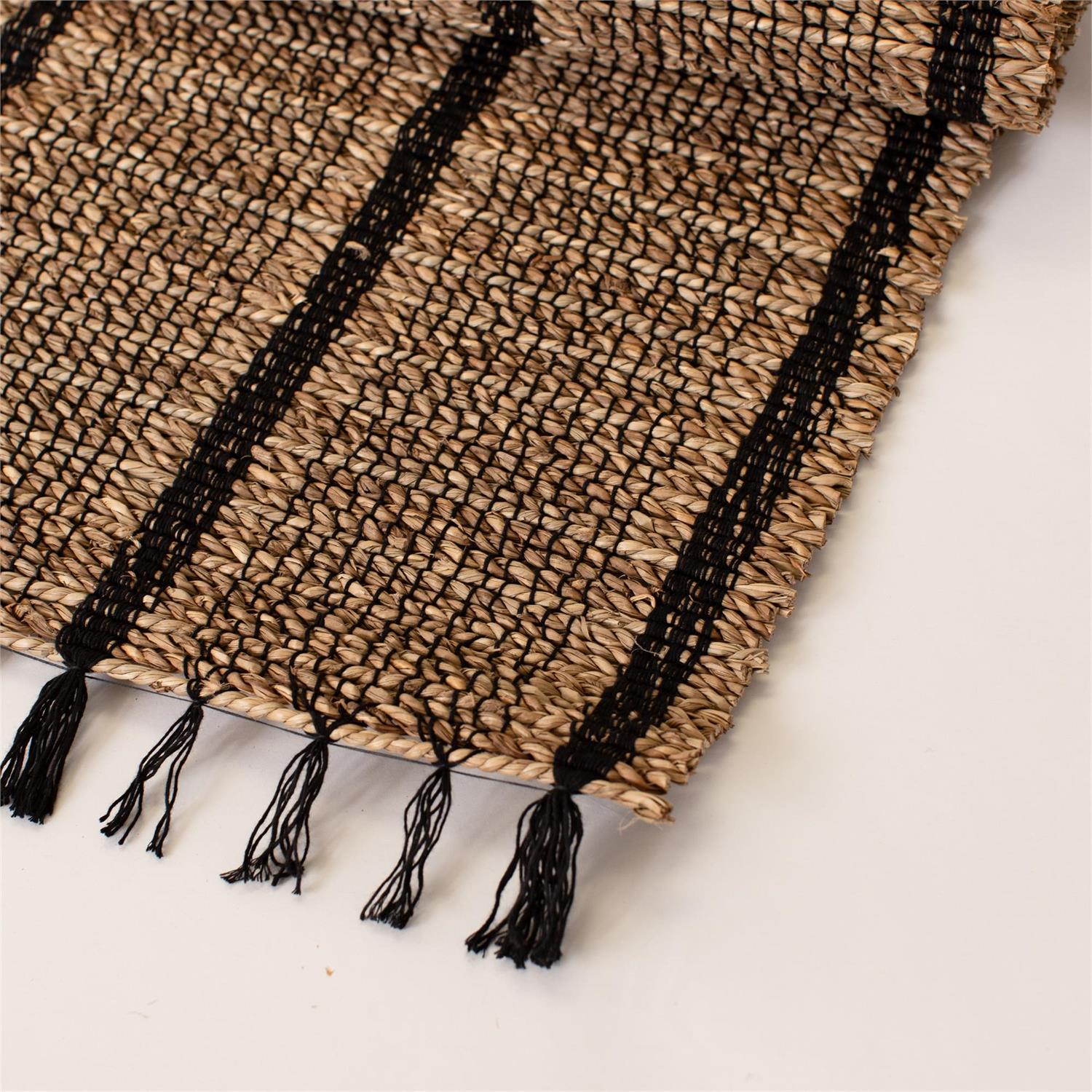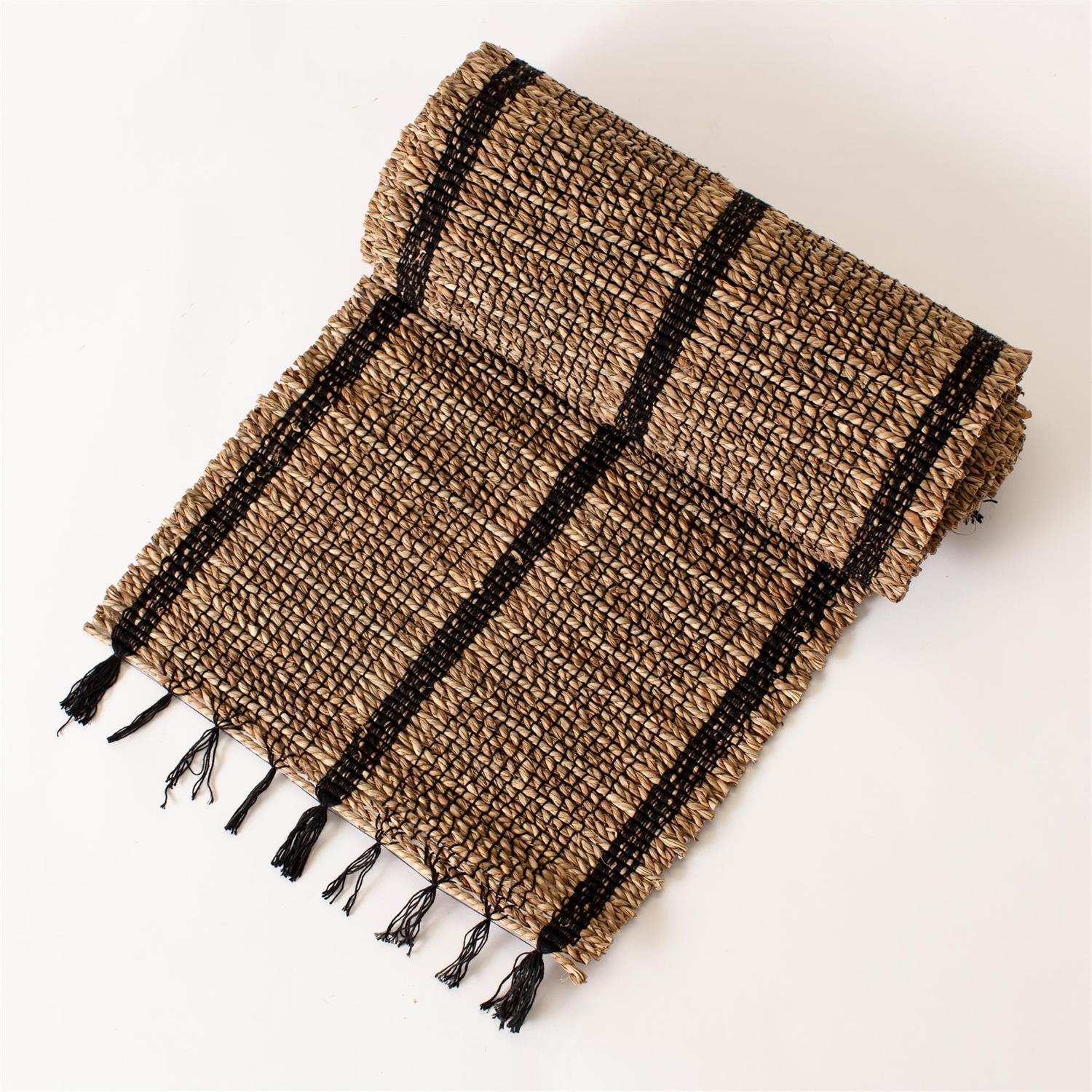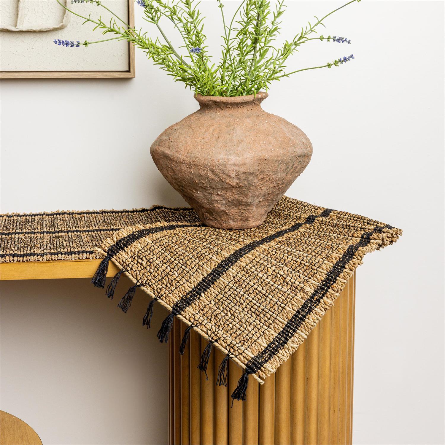 Bring organic texture to your table with this natural and black woven seagrass runner. The earthy tones and bold black stripes create a simple yet striking look, while the tasseled edges add rustic charm. Measuring 72 inches long, it's perfect for layering with farmhouse, primitive, or everyday dining decor.