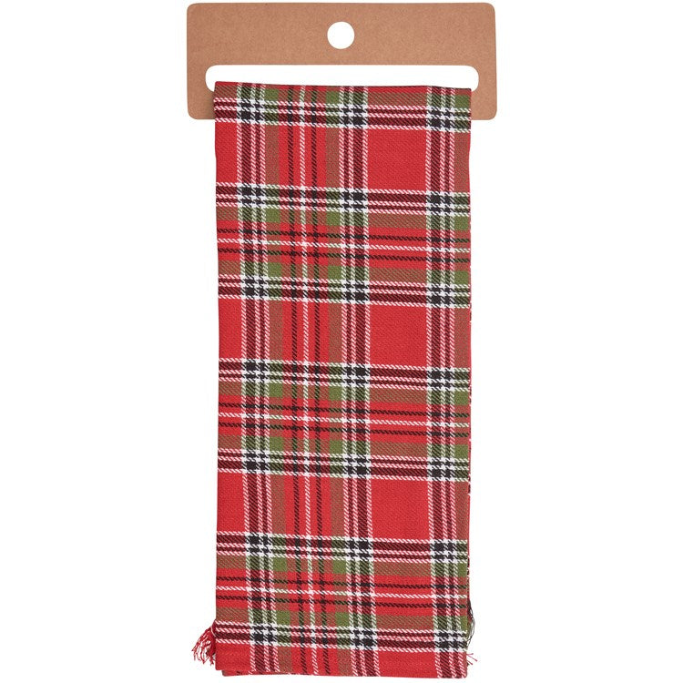 A cotton kitchen towel from our Christmas Collection featuring a stitched art panel with Christmas tartan plaid pattern all-over towel and frayed details on front trim. Art panel displays a pig wearing a Christmas wreath in a winter scene. Design is replicated from original artwork painted onto burlap canvas, giving the art a unique depth and texture. Our Christmas Pig kitchen towel is conveniently machine-washable for easy cleaning. A rustic Christmas-themed kitchen accessory perfect for seasonal use.