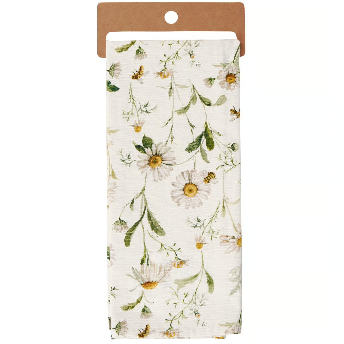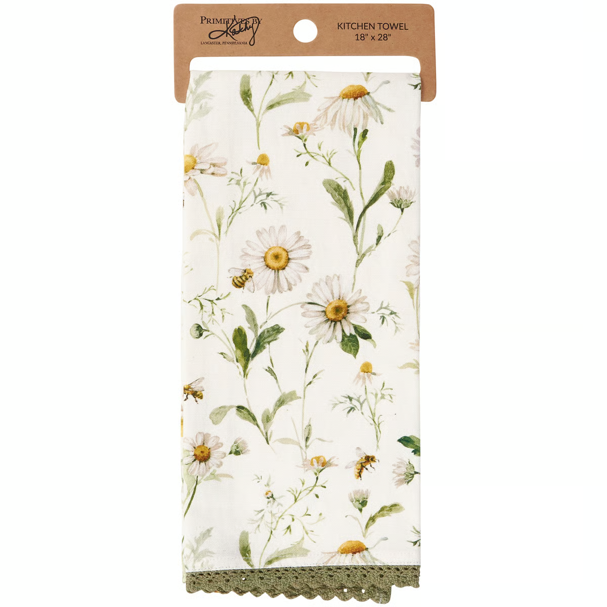 A cotton kitchen towel from our Garden Collection displaying an all-over design of wild daisies with a green lace trim. Designs are replicated from original art hand painted in a delicate watercolor style. Our Daisy Lace kitchen towel is conveniently machine-washable for easy cleaning.