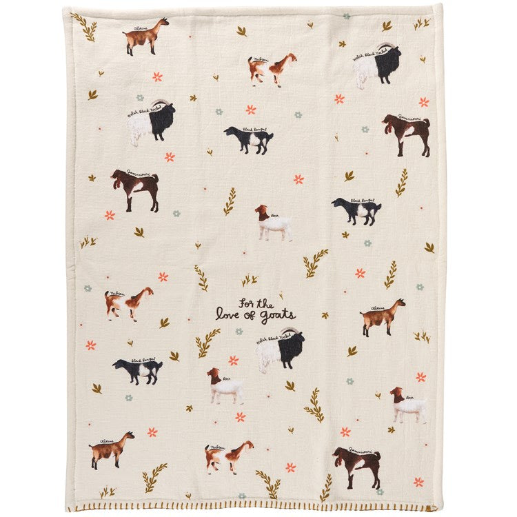 A cotton kitchen towel from our Homestead Collection displaying a goat inspired all-over design replicated from original hand illustrated art. Homestead design features illustrations of goats with their breed name and florals with a goat-themed sentiment on the front that reads "For The Love Of Goats." Goat design is printed on textured slub fabric with a coordinating green hem stitch at the bottom. Kitchen towel features a terrycloth layer on the back for added absorbency and corner loop for hanging. Our Love Of Goats kitchen towel is conveniently machine-washable for easy cleaning. A fun farm-themed gift perfect for an everyday kitchen accessory.