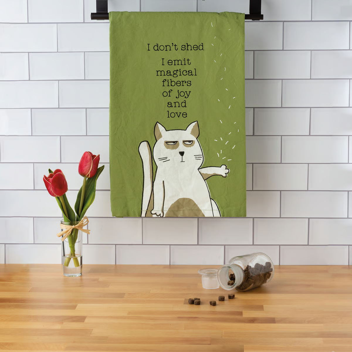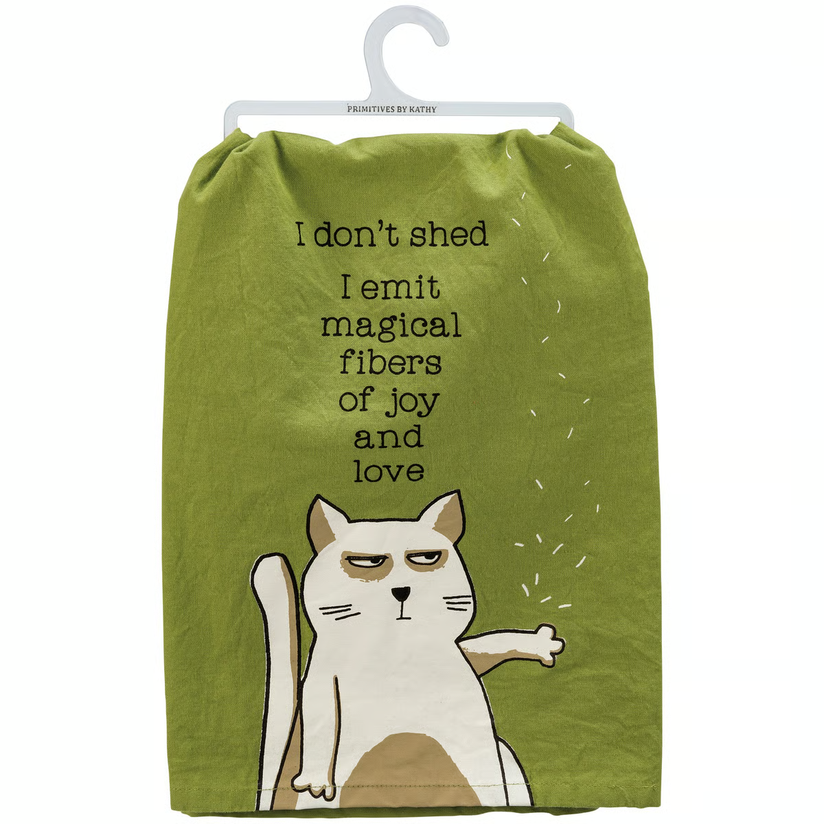 A rustic-inspired cotton kitchen towel from our Pet Collection featuring an "I Don't Shed I Emit Magical Fibers Of Joy And Love" sentiment with sassy cat and cat hair design. Our I Don't Shed kitchen towel is machine-washable.