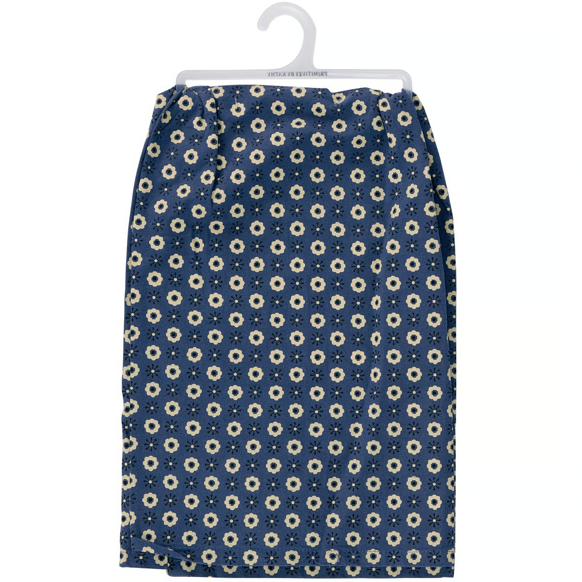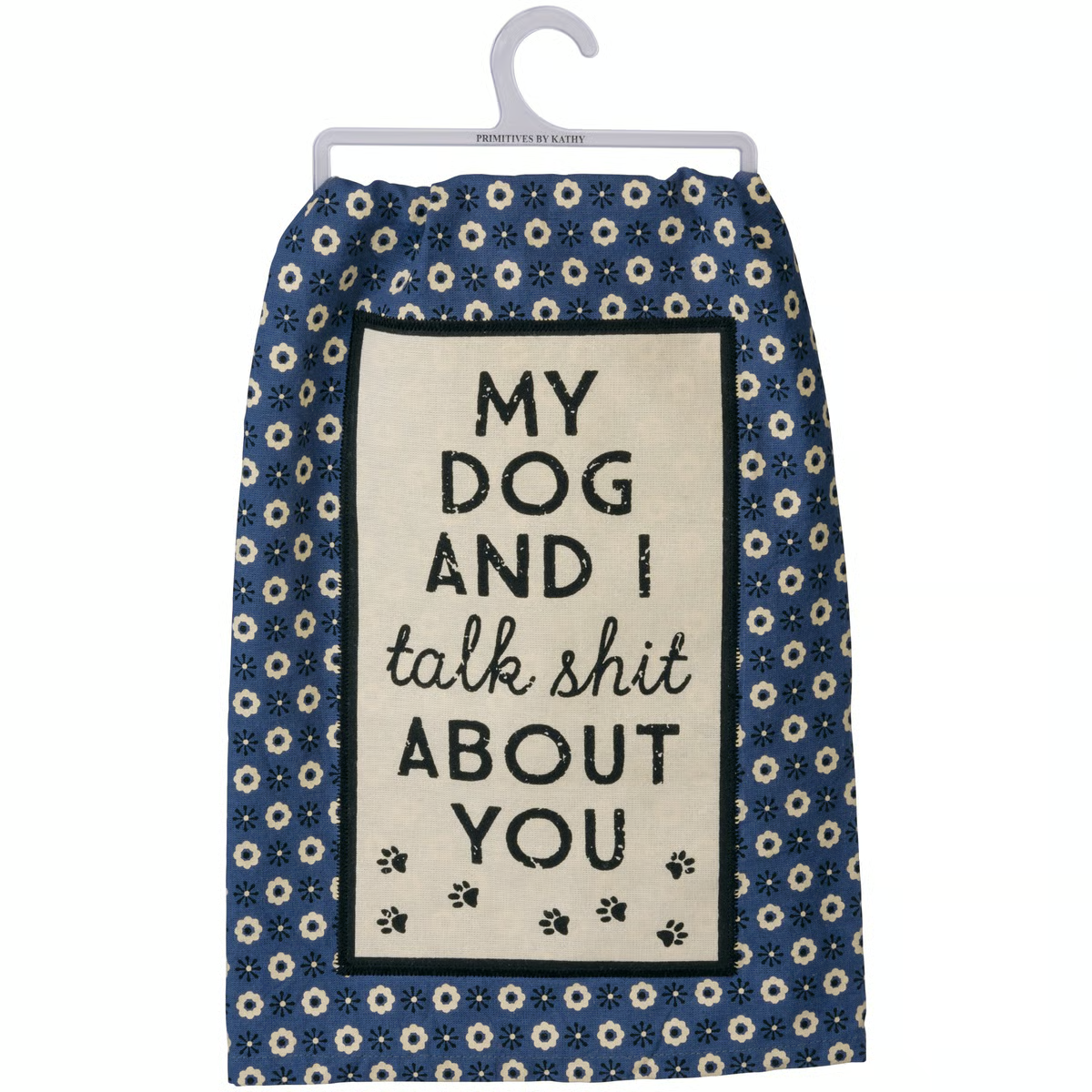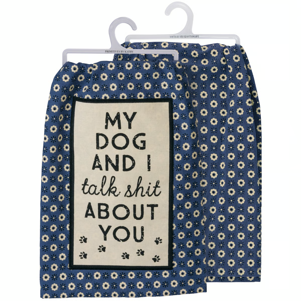 A cotton kitchen towel featuring an all-over floral design, paw print design, and "My Dog And I Talk Shit About You" sentiment. Machine-washable.