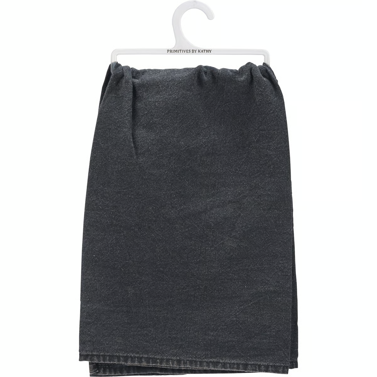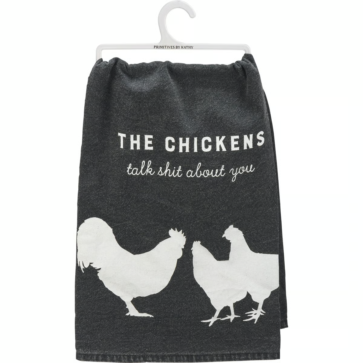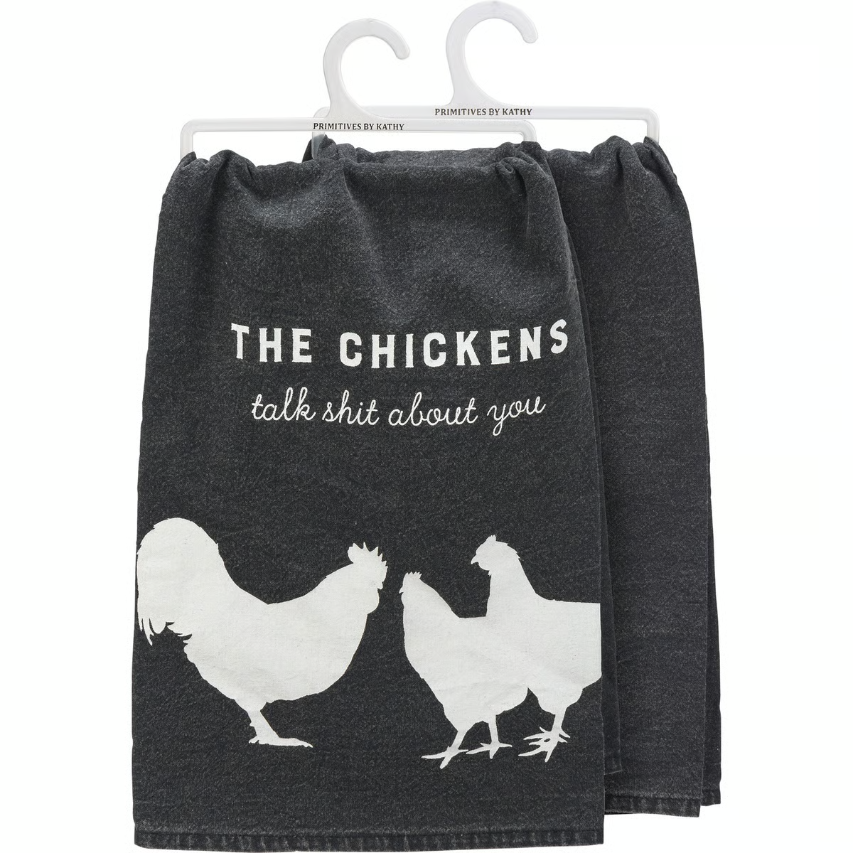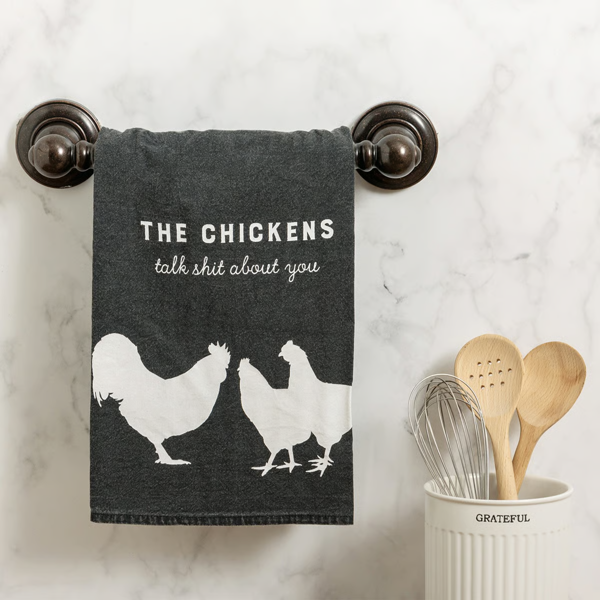 A black cotton kitchen towel featuring a distressed "The Chickens Talk Shit About You" sentiment and chicken silhouette designs. Our The Chickens Talk About You kitchen towel is machine-washable.