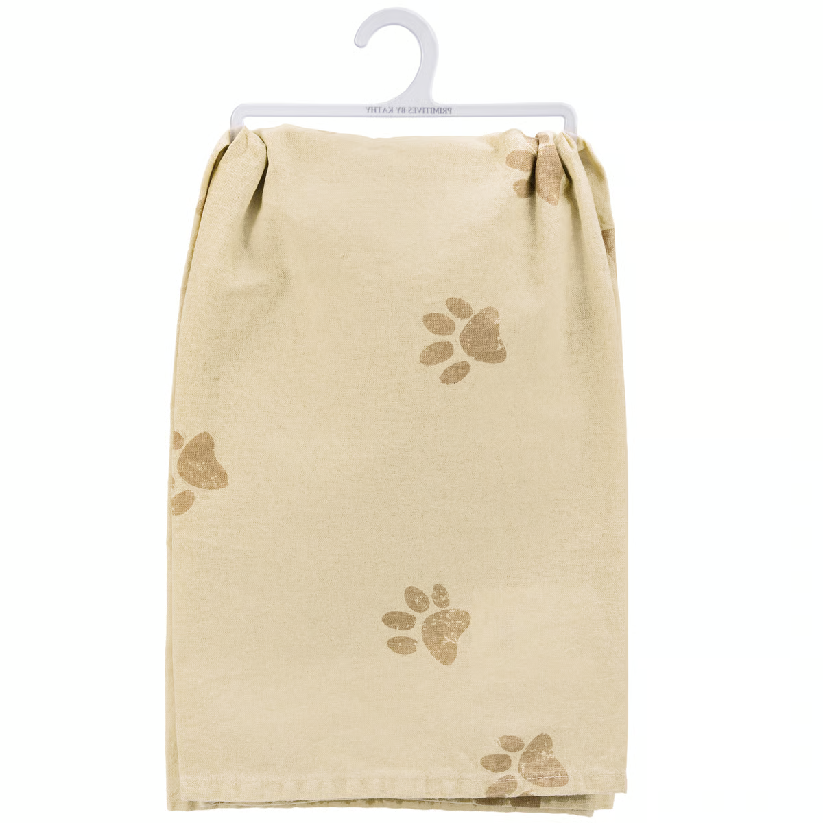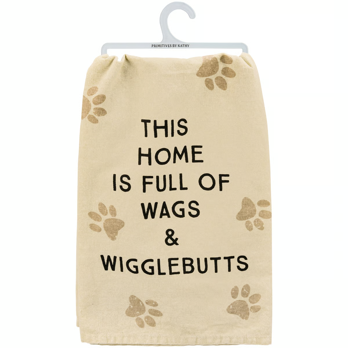 A rustic-inspired cotton kitchen towel from our Pet Collection featuring a "This Home Is Full Of Wags & Wigglebutts" sentiment with all-over paw print designs. Our Wags & Wigglebutts kitchen towel is machine-washable.