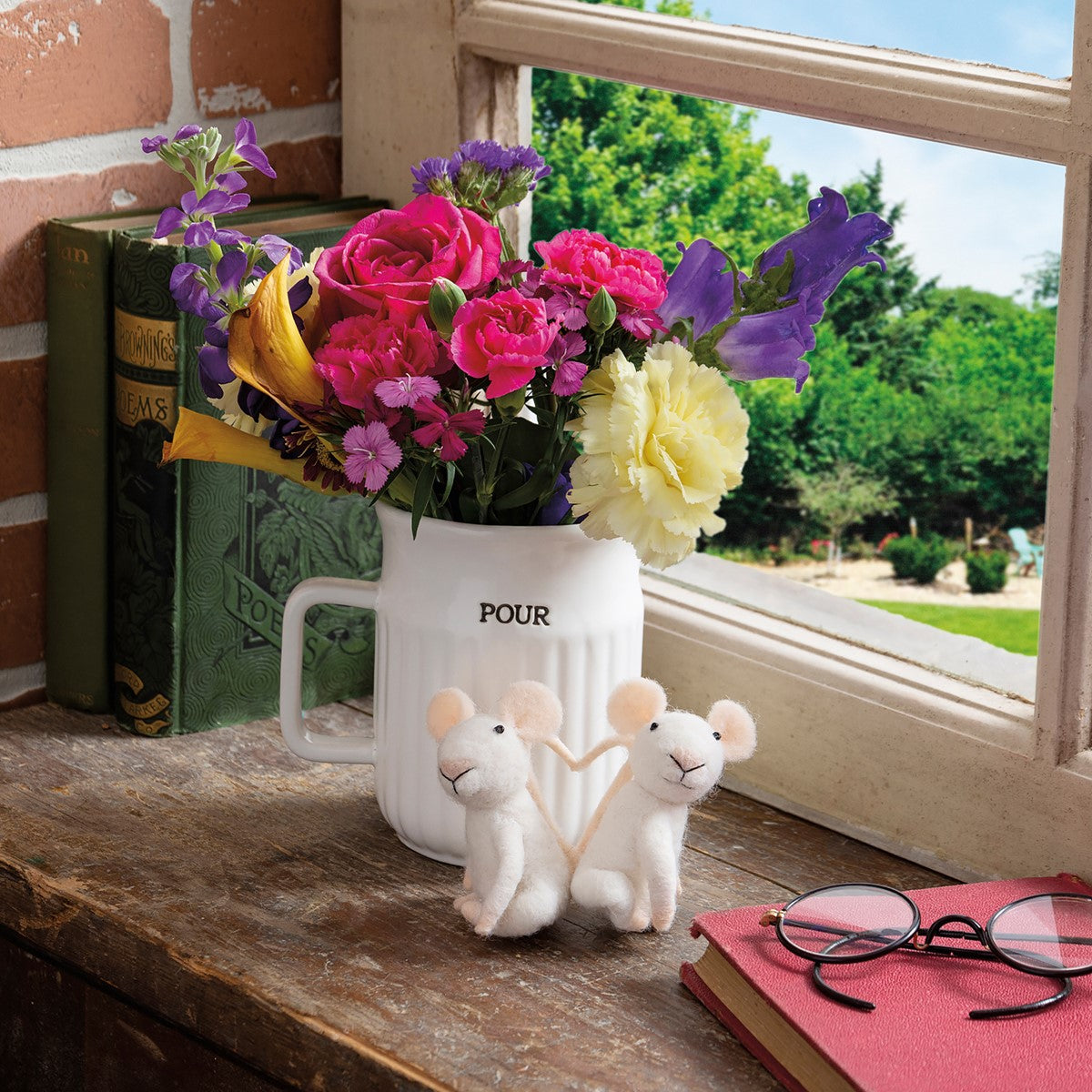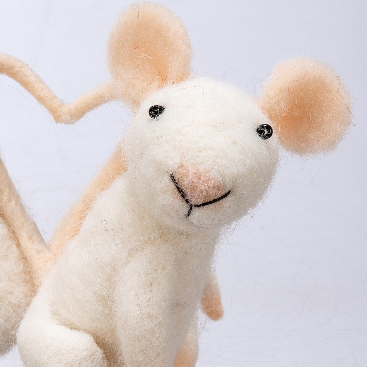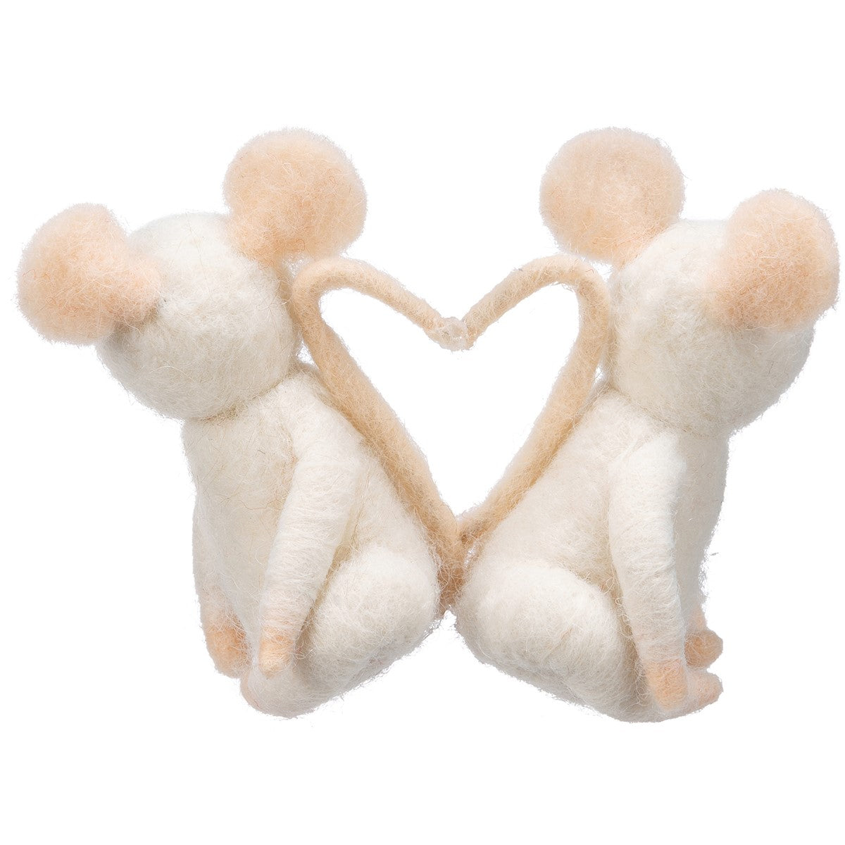 A felt critter featuring two white mice attached via their tails which are positioned in the shape of a heart.
