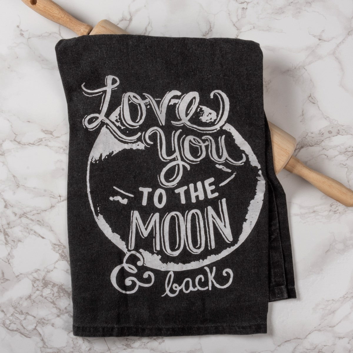 A black and white cotton kitchen towel featuring unique chalk art, hand lettered "Love You To The Moon & Back" sentiment, and moon design. Machine-washable.