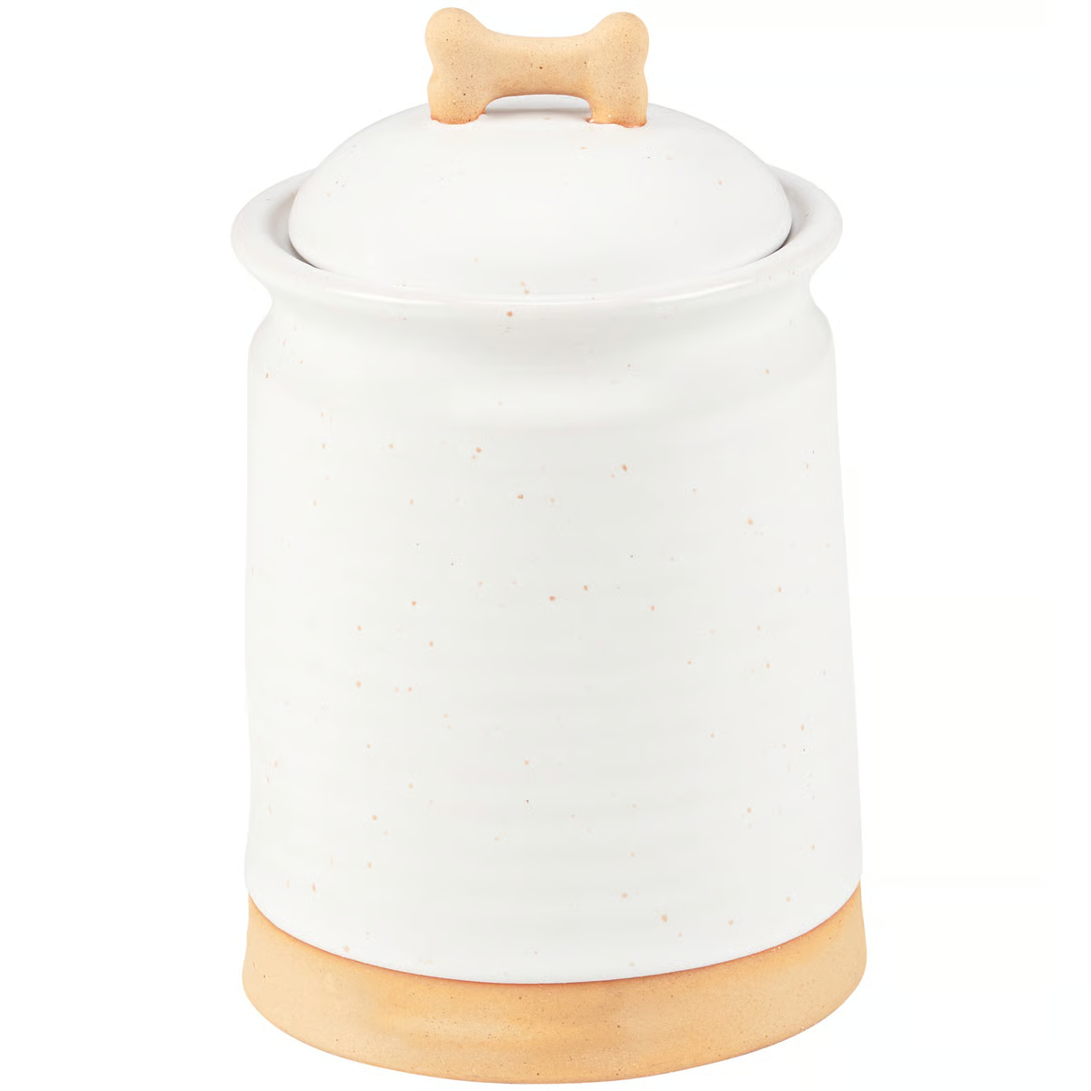 A stoneware treat jar from our Pet Collection displaying a simple cream glaze and bare ceramic pet inspired design that easily coordinates with a variety of home décor. Design features embossed dog bone shape with ""Bark" sentiment and sculpted dog bone on top of the lid. Our Bark Treat Jar is conveniently dishwasher and food safe for easy use. A fun pet-themed kitchen accessory perfect for storing dog treats.