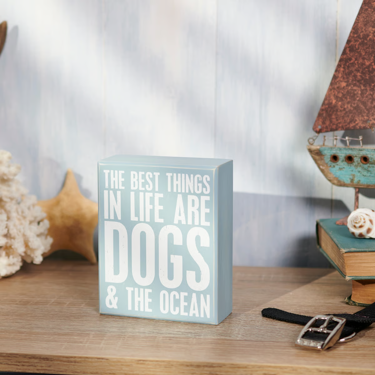 A wooden box sign from our Beach Collection displaying a box sign style sentiment featuring a fun combination of dog and beach themes that reads "The Best Things In Life Are Dogs & The Ocean." Box sign features distressed details with coordinating ocean blue color on sides and back. Our Dogs & Ocean box sign is easy to hang or can free-stand alone. A fun beach-themed home accent with a variety of display options.