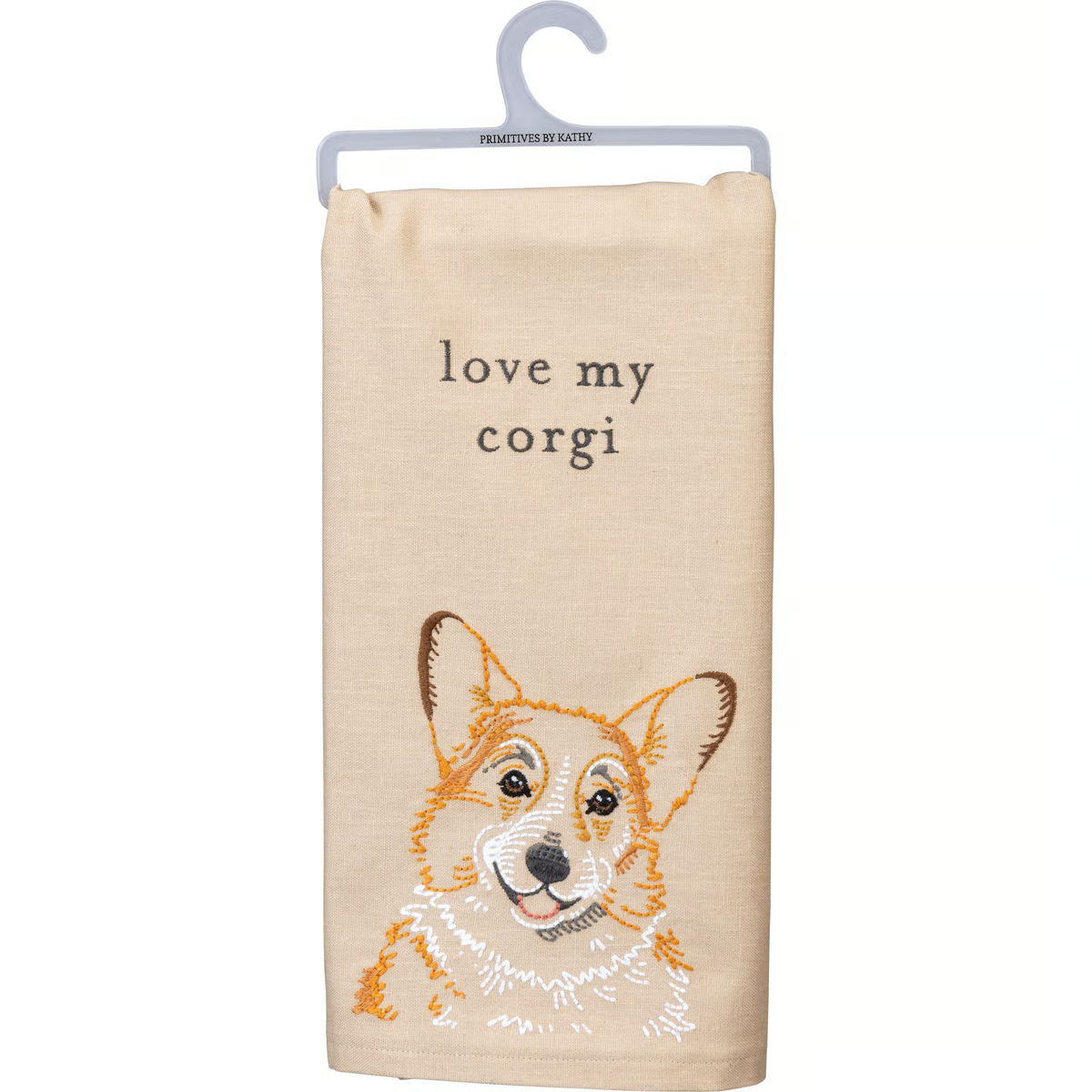 A cotton-linen blend kitchen towel from our Pet Collection displaying a beautifully embroidered design of a corgi and coordinating sentiment that reads "Love My Corgi." Our Love My Corgi kitchen towel is conveniently machine-washable for easy cleaning. Corgi kitchen towel is packaged on a clear plastic hanger to easily display on rack. A lovely pet-themed kitchen accessory perfect for everyday use.