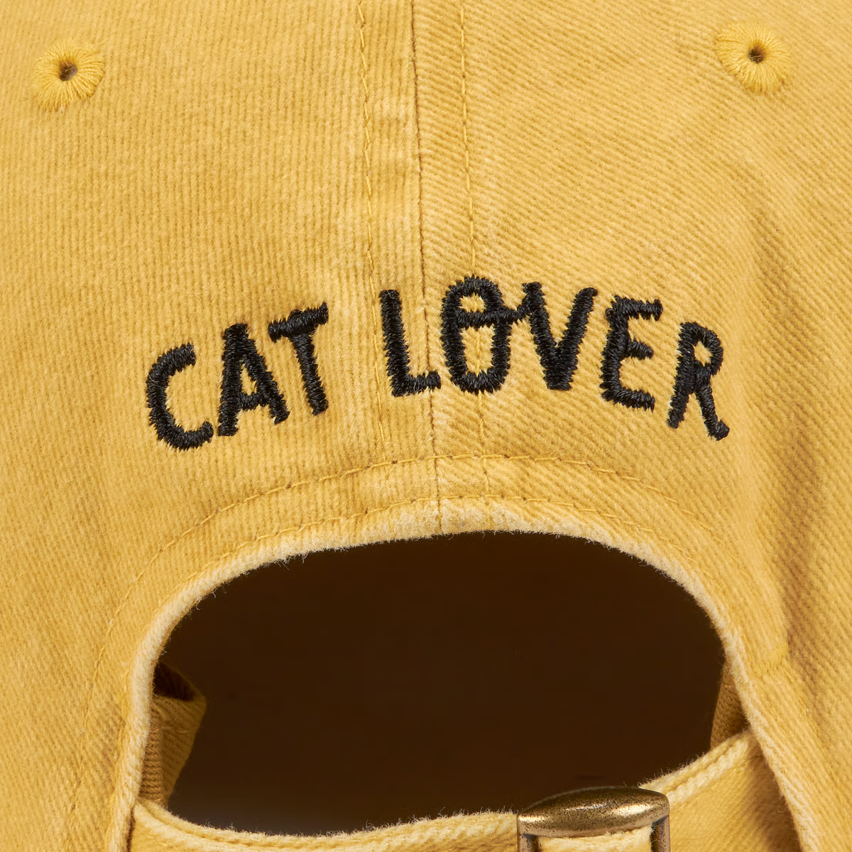 A golden yellow baseball cap from our Pet Collection displaying cat silhouettes on the front with a cat-themed sentiment on the back that reads "Cat Lover." Pet parent hat features fully embroidered designs for added detail. Our Cat Lover baseball cap is one size fits most with an adjustable metal buckle to create the perfect fit. Hand wash only. A fun pet-themed gift perfect for an everyday accessory.