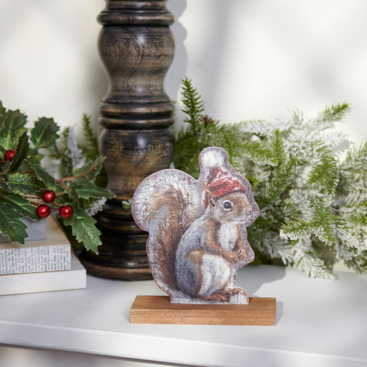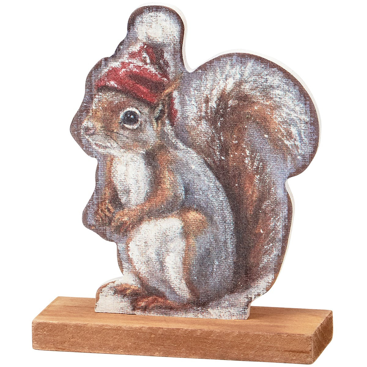 A wooden stand up dรฉcor piece from our Christmas Collection displaying a cutout design of a woodland squirrel wearing a winter hat replicated from original artwork painted onto burlap canvas, giving the art a unique depth and texture. Seasonal stand up is double-sided to easily view art on either side and is attached to a natural wood base. Our Winter Squirrel stand up is designed to free-stand on any flat surface. A rustic winter-themed home accent that can be easily displayed in any home or work space.