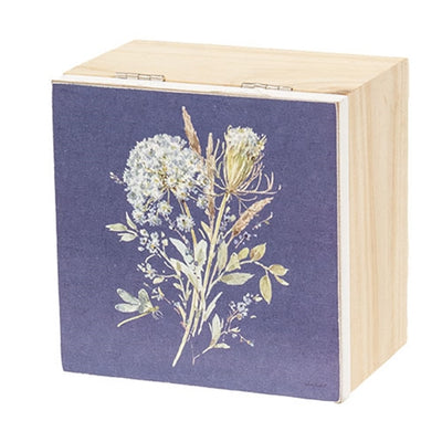 The Blue Floral Hinged Trinket Box is a versatile decorative box made with simple yet charming design. The base of the box is made of unfinished light wood, and the top features delicate floral design on a dark blue background. White edges outline the top of the box and it has a smooth finish. A pair of metal hinges allow the box to easily open and close.