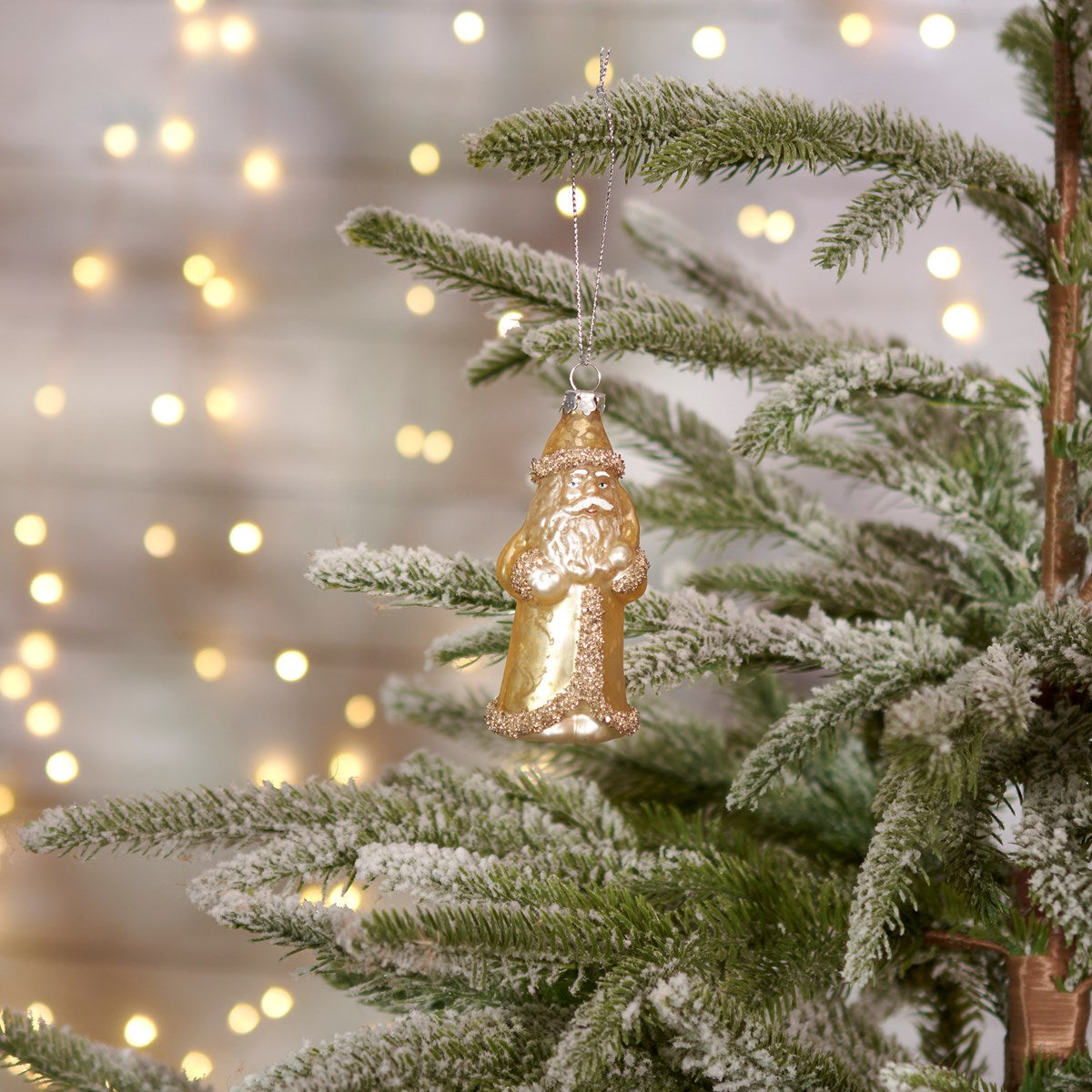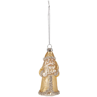 A glass ornament from our Christmas Collection displaying a vintage Santa design in gold outfit with glitter accents. Our glass Gold Santa ornament is ready to hang via the top loop and string. A vintage-style seasonal home accent perfect for a Christmas tree or for gifting.