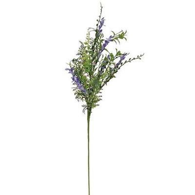 The Lakeside Iris Spray is a decorative floral spray featuring a flexible green-wrapped stem. The spray is decorated with greenery, varied in color and texture, along with purple pip berries and purple fabric blooms. This spray is perfect for spring and summer with its bright colors and diverse textures. Display it within a floral arrangement or on its own in a vase, bottle, or jar.