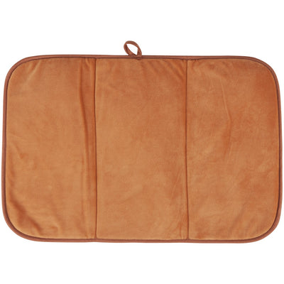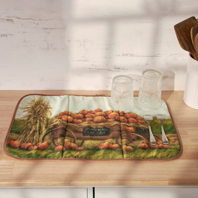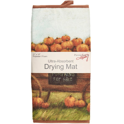 An ultra-absorbent drying mat from our Fall & Harvest Collection displaying a fall scene of a pumpkin wagon. Design is replicated from original artwork painted onto burlap canvas, giving the art a unique depth and texture. Seasonal drying mat features full color design on the 21 inch by 14 inch space to place items to dry with coordinating brown color on the back and trim. Our Pumpkin Wagon drying mat includes a hanger at the top to display design or to air dry when not in use. Drying mat conveniently folds up for easy storage. Machine-washable. A rustic fall-themed kitchen accessory perfect for seasonal use.