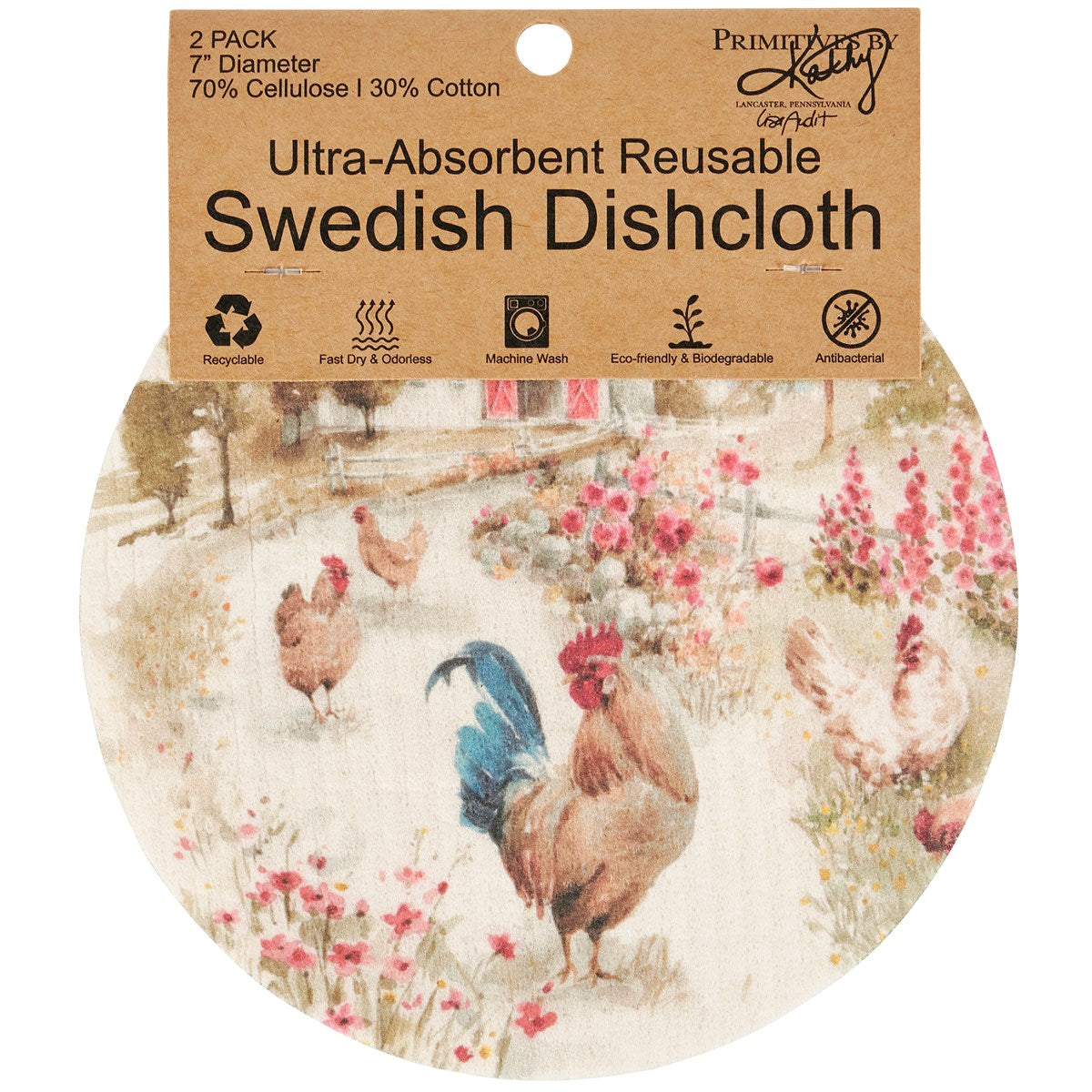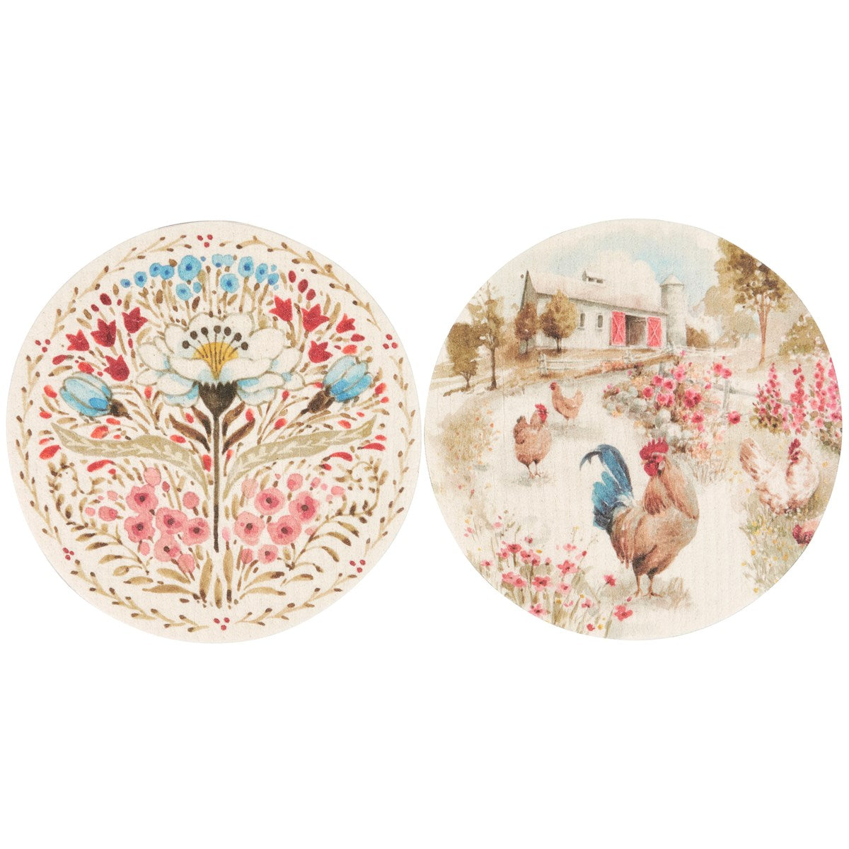 Safe to use on all types of surfaces, eco-friendly Swedish Dishcloths dry quickly and are antibacterial for more hygienic cleaning with reduced waste. This set of 2 round Swedish Dishcloths from our Farmhouse Collection features charming farm themed designs replicated from original art hand painted in a delicate watercolor style. Farm designs include a scene of roosters and farmhouse on one dishcloth and a rustic floral design on the other dishcloth. Our Roosters Swedish cloth set is ultra-absorbent and conveniently machine-washable for easy cleaning and reuse. A rustic farm-themed set of reusable dishcloths perfect for replacing dull sponges and paper towels with long-lasting colorful designs.