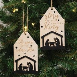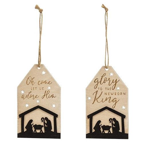 Set of 2 Let Us Adore Him Nativity Silhouette Wooden Tag Ornaments