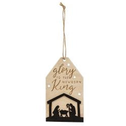 The Let Us Adore Him Tag Ornaments are an assortment of two wooden cutout ornaments in rectangular tag shapes. The ornaments each feature a black nativity scene silhouette, star cutouts, and scripted letters reading "Oh come let us adore Him" or "Glory to the newborn King". The ornaments come with jute rope loops to use for a hanging display on a Christmas tree branch during the holiday season, for a rustic and inspirational addition to the home.